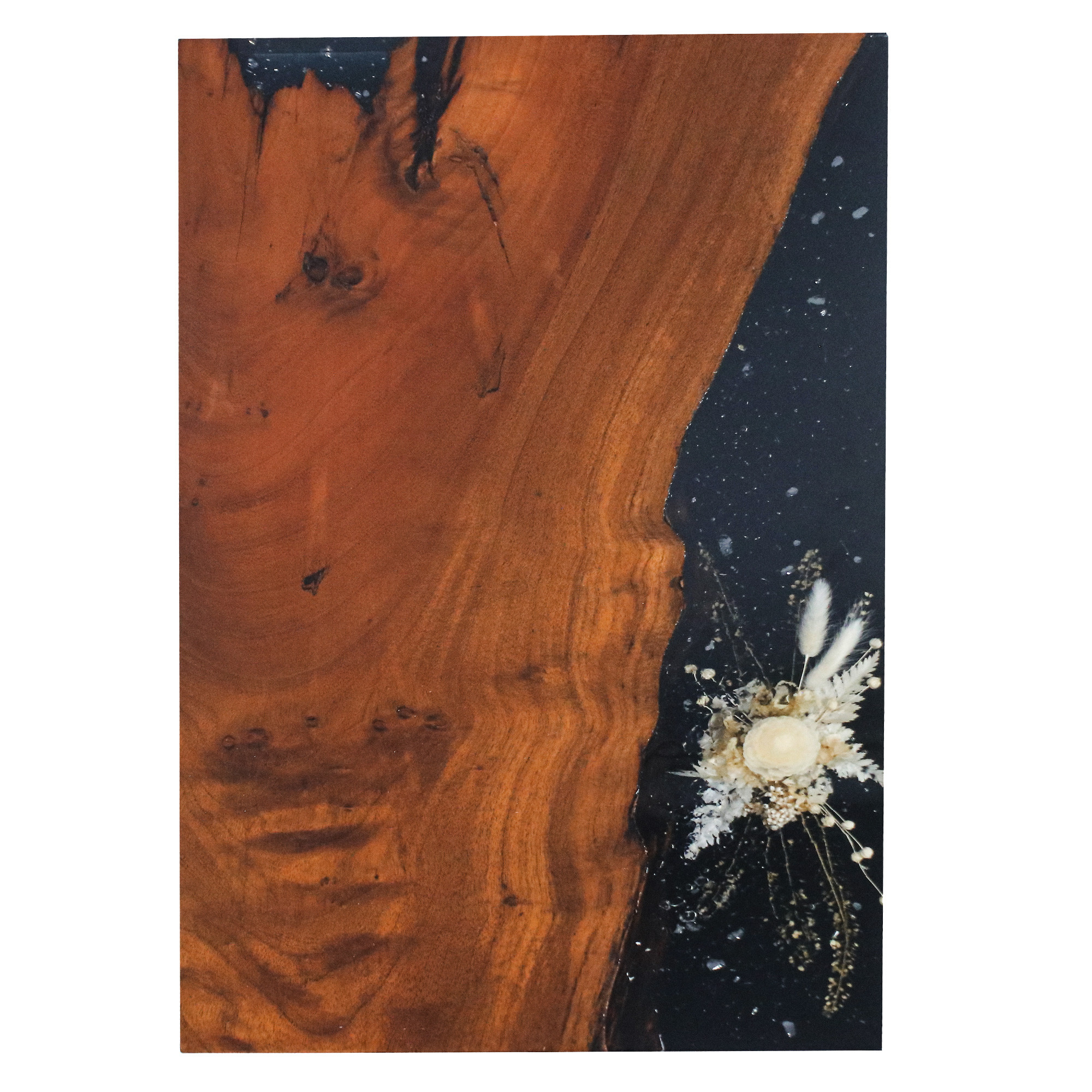 This modern wall artwork pulses with nocturnal energy, where midnight-black resin meets the warm, organic grain of mulberry wood in perfect harmony. Vibrant dried flowers and foliage burst from the glossy surface, their preserved forms creating dramatic botanical stories frozen in time beneath the protective resin coating. Thailand's Martin Halpin crafts this contemporary piece with thoughtful functionality—a sturdy steel wire on the back ensures effortless installation, making it ready to command attention on any wall that craves bold, nature-inspired drama.
