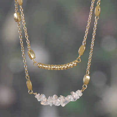 Moonstone and Brass Double-Layered Strand Pendant Necklace, 'Iridescent Flair'