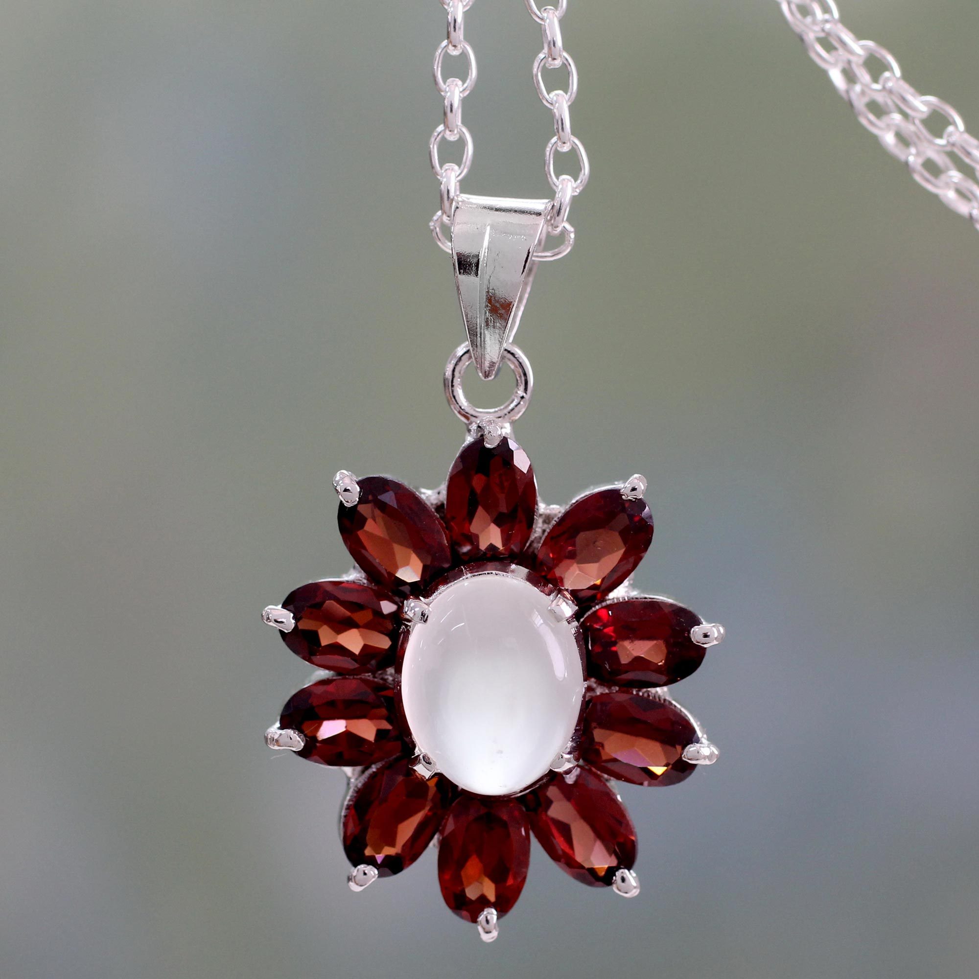 A cabochon of milky moonstone shares its cool glow with blazing scarlet garnets in this pendant necklace from Aparna in India. The gems are set in polished sterling silver for a dramatically beautiful necklace. The pendant centers a classic sterling silver cable chain.