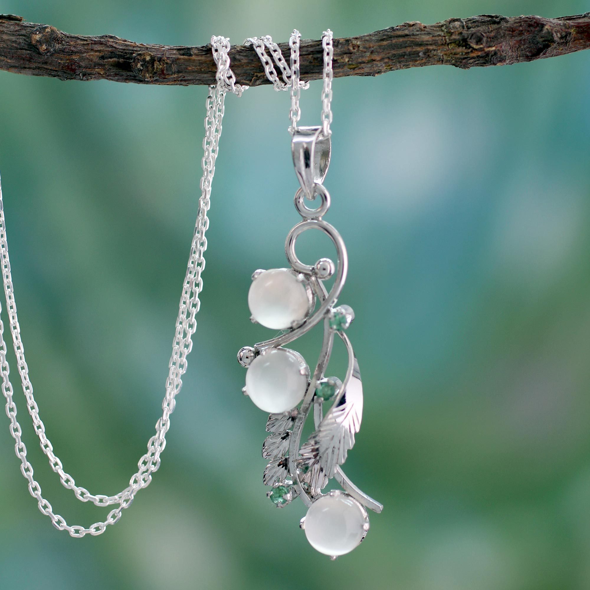 This charming necklace comes from India's Alok Jain. Featuring three luminous moonstones and three faceted emeralds, the pendant hangs on a silver chain.