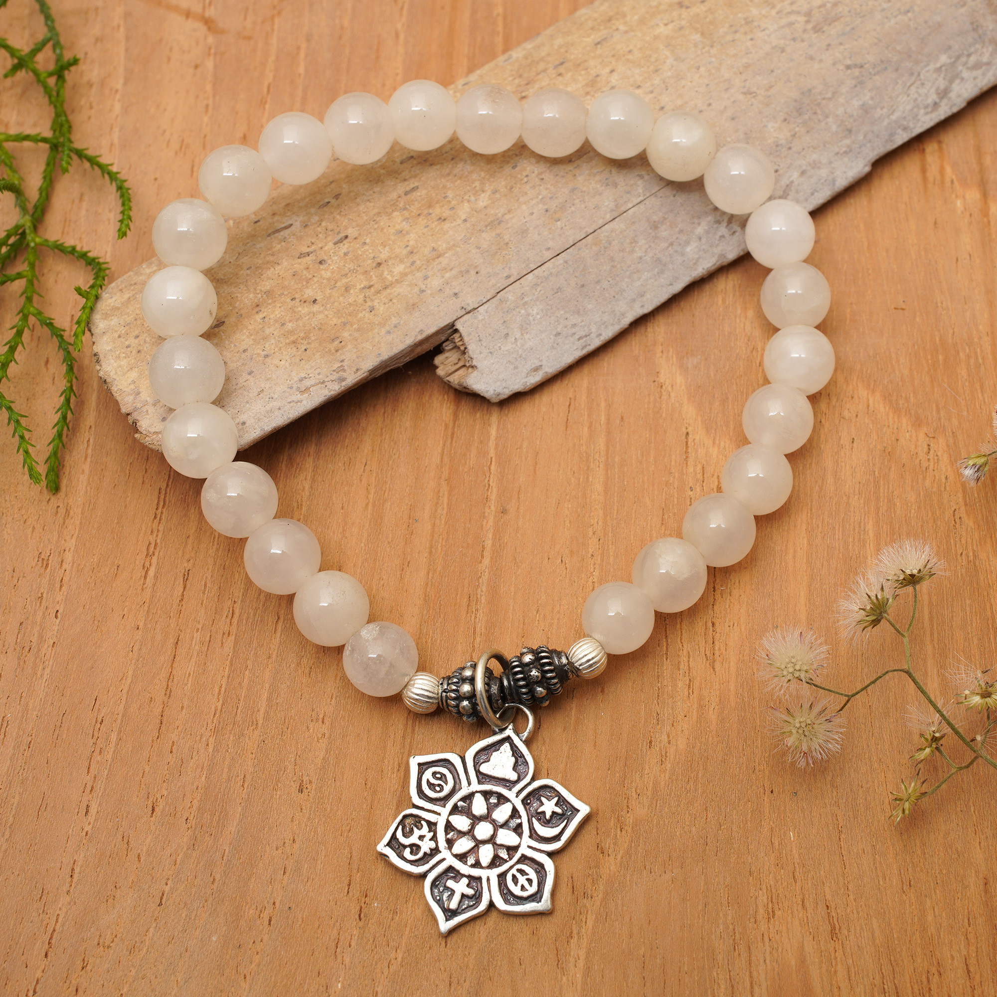 Crafted in sterling silver, a splendid flower charm features world religious and spiritual symbols, emphasizing a need for worldwide unity and peaceful coexistence. Bali's Ketut Sulastri designs this stretch bracelet, stringing it with round beads of milky moonstone.