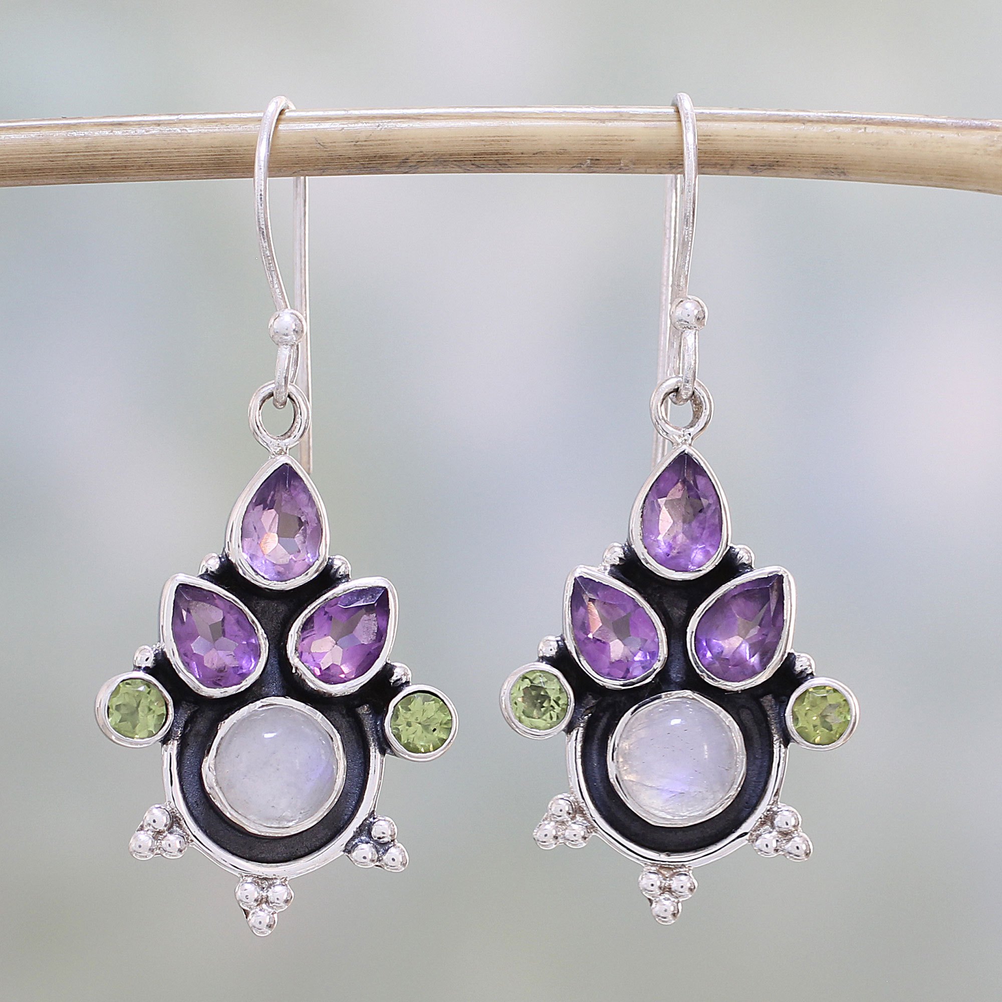 A colorful bunch is featured in this striking pair of earrings, with over three carats of amethyst and peridot stones alongside natural rainbow moonstone cabochons. With a lifelong passion for Indian jewelry, Neeru Goel proudly presents these sterling silver dangle earrings.