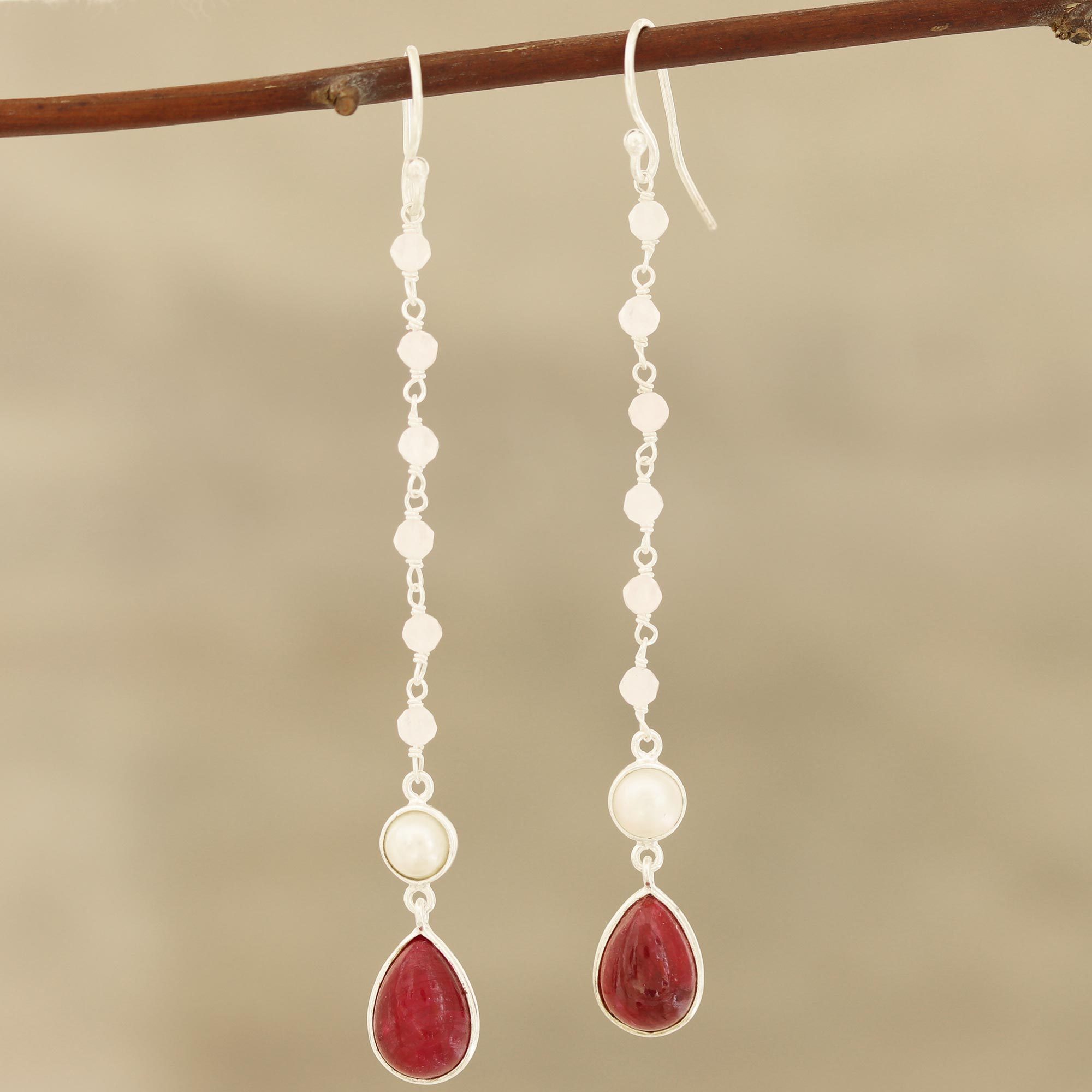 Glowing with harmonious hues of red, white, and pink, elegant gemstones and cultured pearls are displayed in this pair of dangle earrings from India. Neetu Barathi designs these dangle earrings, which feature links of petite rose quartz gems that align above cultured pearls and teardrop rubies. These earrings are crafted from high-polish sterling silver.
