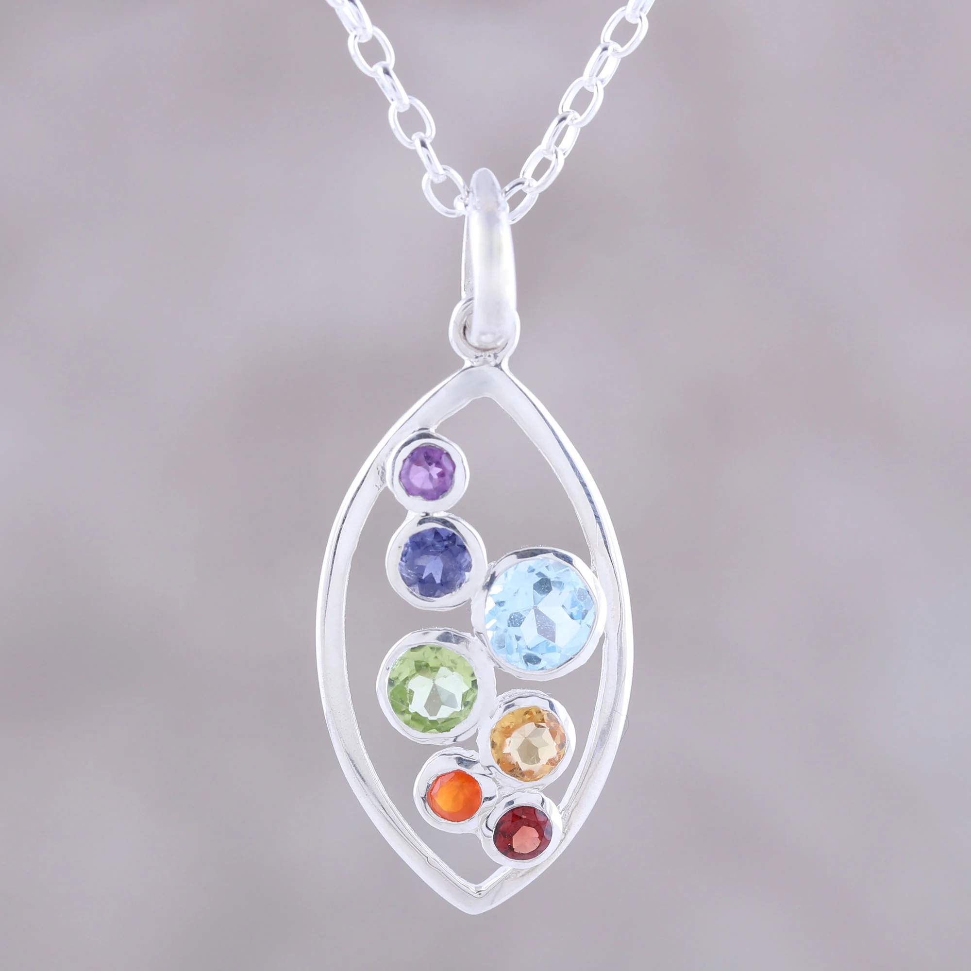 A pointed ellipse of sterling silver frames seven round, faceted gemstones of varying sizes in this pendant necklace presented by Alok Jain of India. Every color of the rainbow is represented by the different gemstones in the pendant--garnet, carnelian, citrine, peridot, blue topaz, iolite, amethyst-- creating a beautiful kaleidoscope of color.