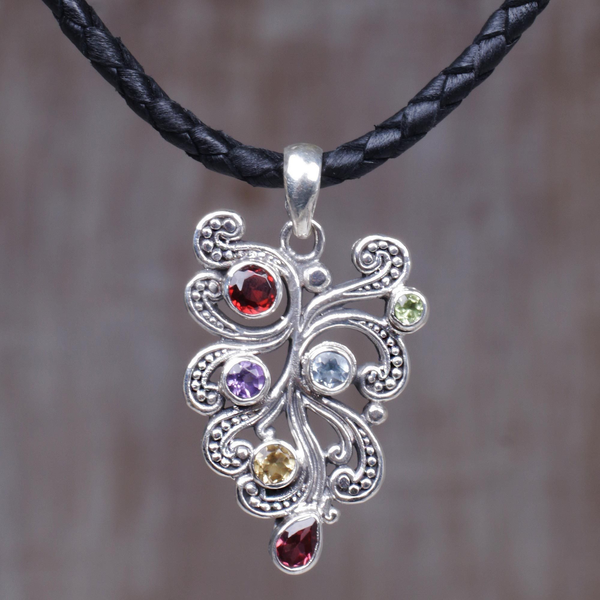 From Indonesian artisan Putu Putri comes this exquisite pendant necklace. A beautiful, ornate fern handcrafted out of sterling silver hangs from a woven black leather cord, combining elegance and simplicity. The pendant is studded with the following dazzling gemstones: two garnets, a peridot, an amethyst, blue topaz, and citrine.