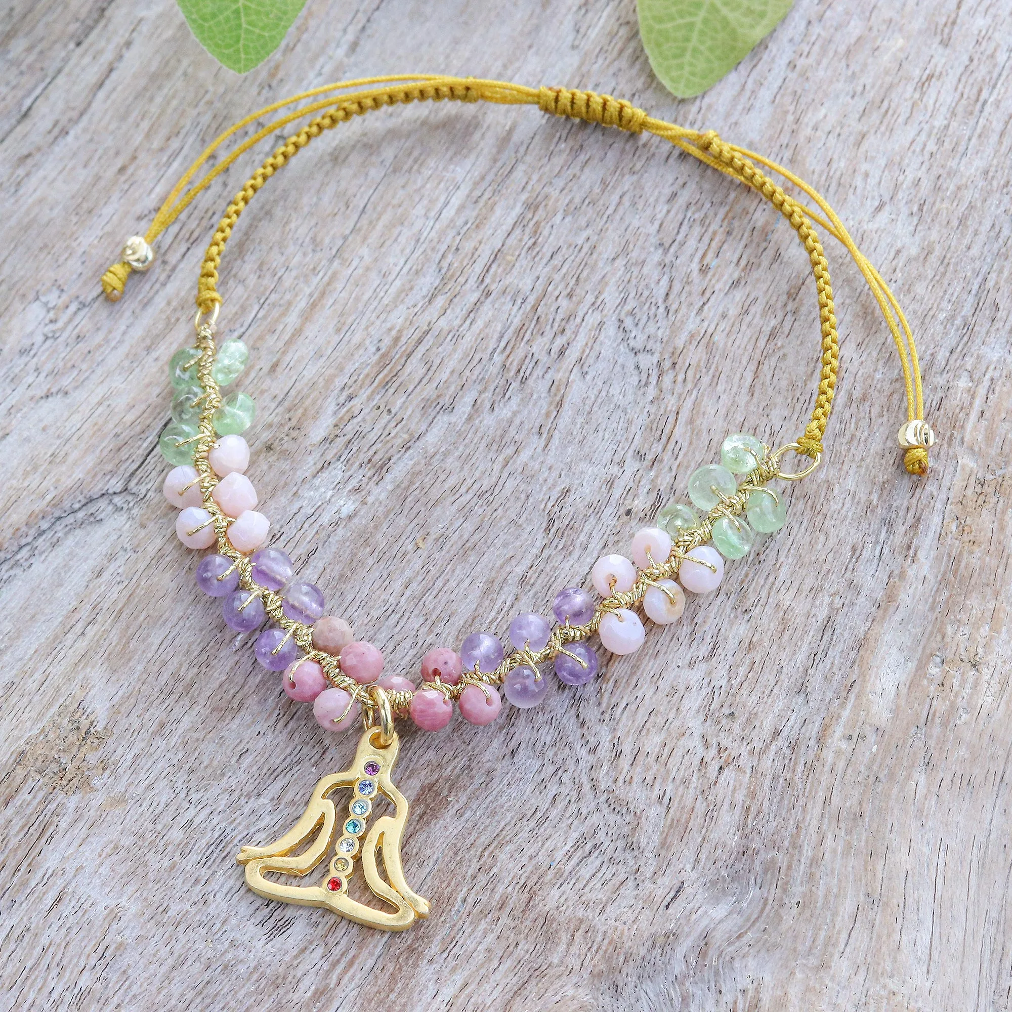 Every knot tells a story in this wanderlust-worthy macrame bracelet, where earthy craft meets colorful magic. Thai artisan Saranarat orchestrates a brilliant parade of peridot, moonstone, amethyst, rhodochrosite and glass beads, with a 24k gold-plated chakra pendant that adds whispers of metallic warmth to the free-spirited design. Its intricately knotted cord is adjustable, topped by petite brass beads.