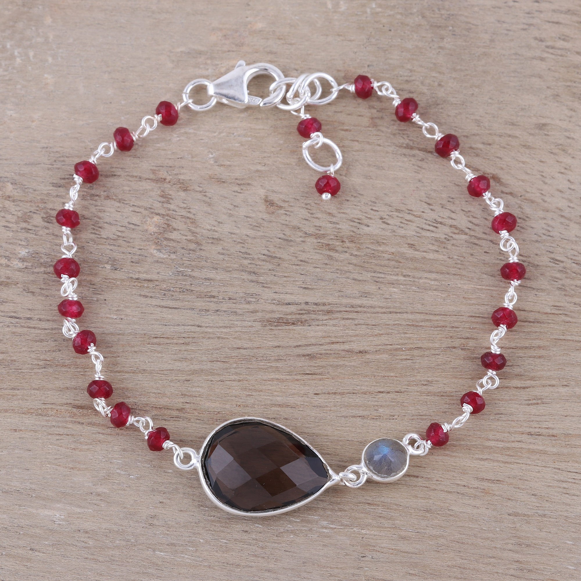 Weighing six carats, a single checkerboard faceted stone of smoky quartz forms the pendant of this bracelet from India. Neetu Barathi designs the bracelet, circling the wrist with sterling silver and garnet links, culminating in a natural labradorite stone that accompanies the pendant.