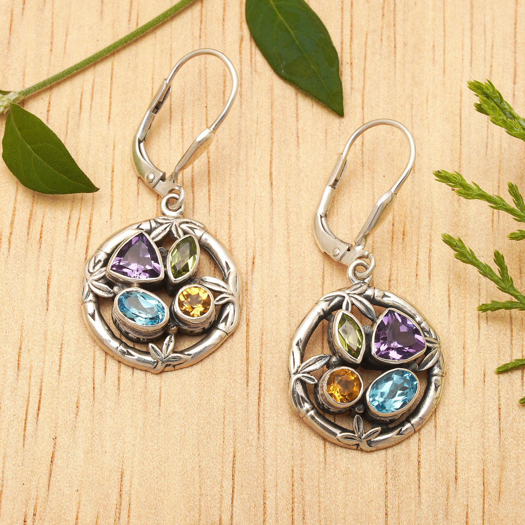 Resplendent with sparkling gems, this original earring design by Bali's Kadek Hendra features silver circles that resemble bamboo stalks. Hendra crafts the earrings from sterling silver and adds 3 carats of amethyst, blue topaz, citrine, and peridot cut in different shapes.