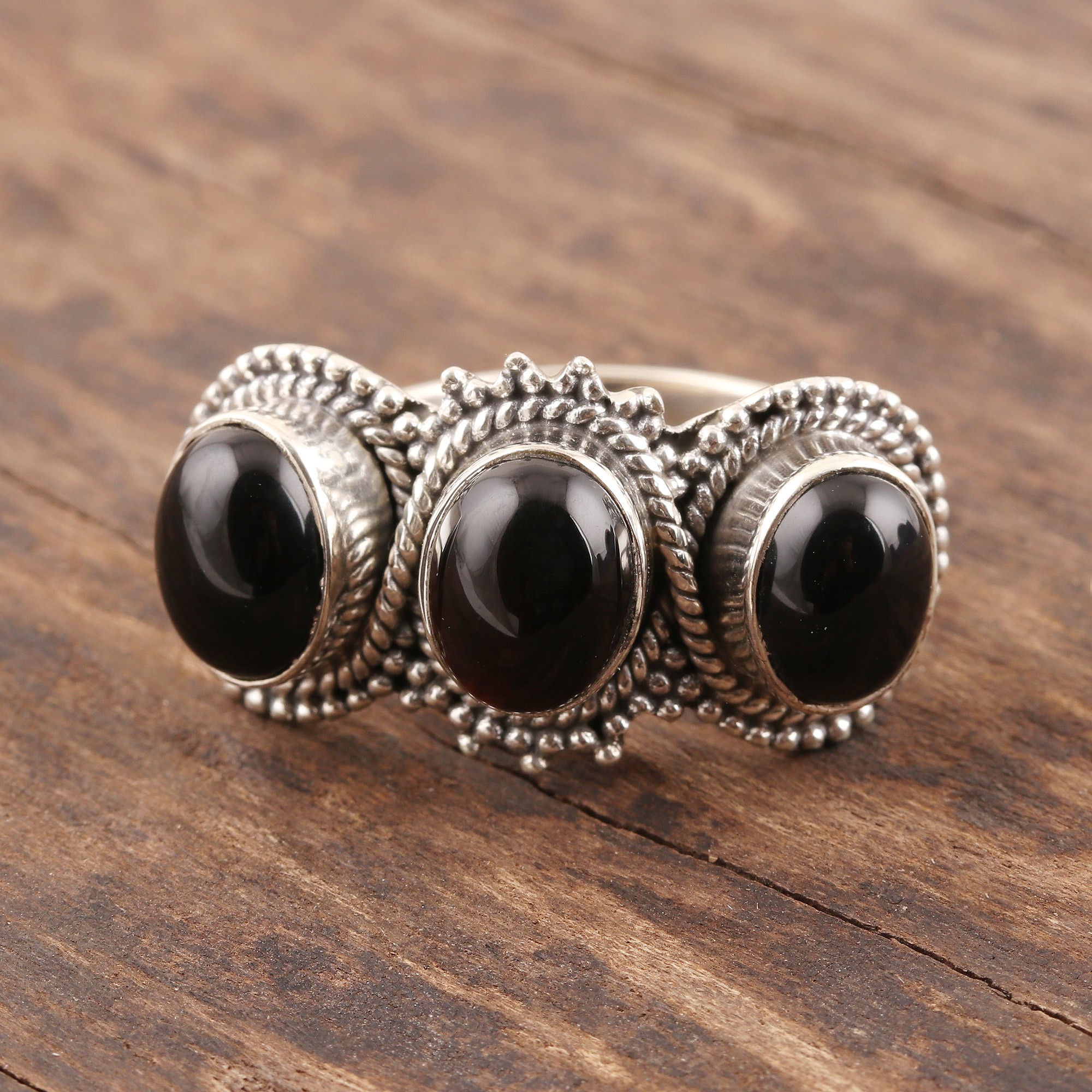Displayed side-by-side, a trio of oval onyx cabochons is black as midnight. Indian artisan Rakesh Rana creates this cocktail ring, framing each stone with rope and dot patterns in sterling silver.