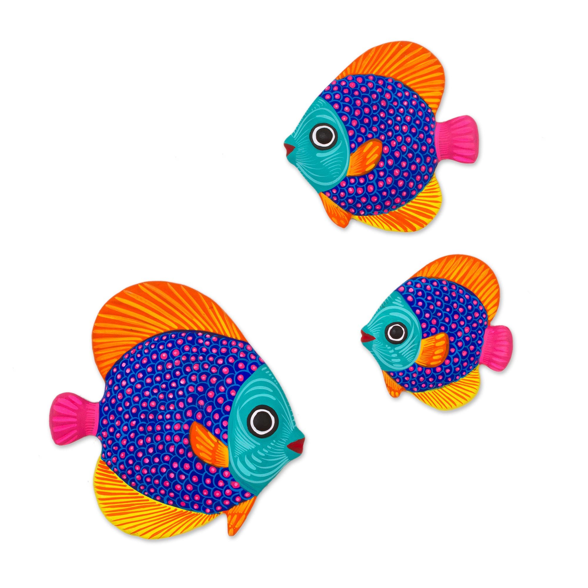Hand-painted in bright shades of turquoise, lapis, fuchsia, and tangerine, this set of three fish will liven up the walls of your home. From artisans Maria and Esteban of Mexico, the pieces of wall art are crafted from ceramic.