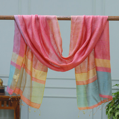 A realm of sweetness awakens in the stripes and details that compose Khitish's newest shawl. Indian artisans work with traditional techniques to craft this silk piece, whose palette of red, orange, blue and green hues creates two pretty styles for a reversible design.
