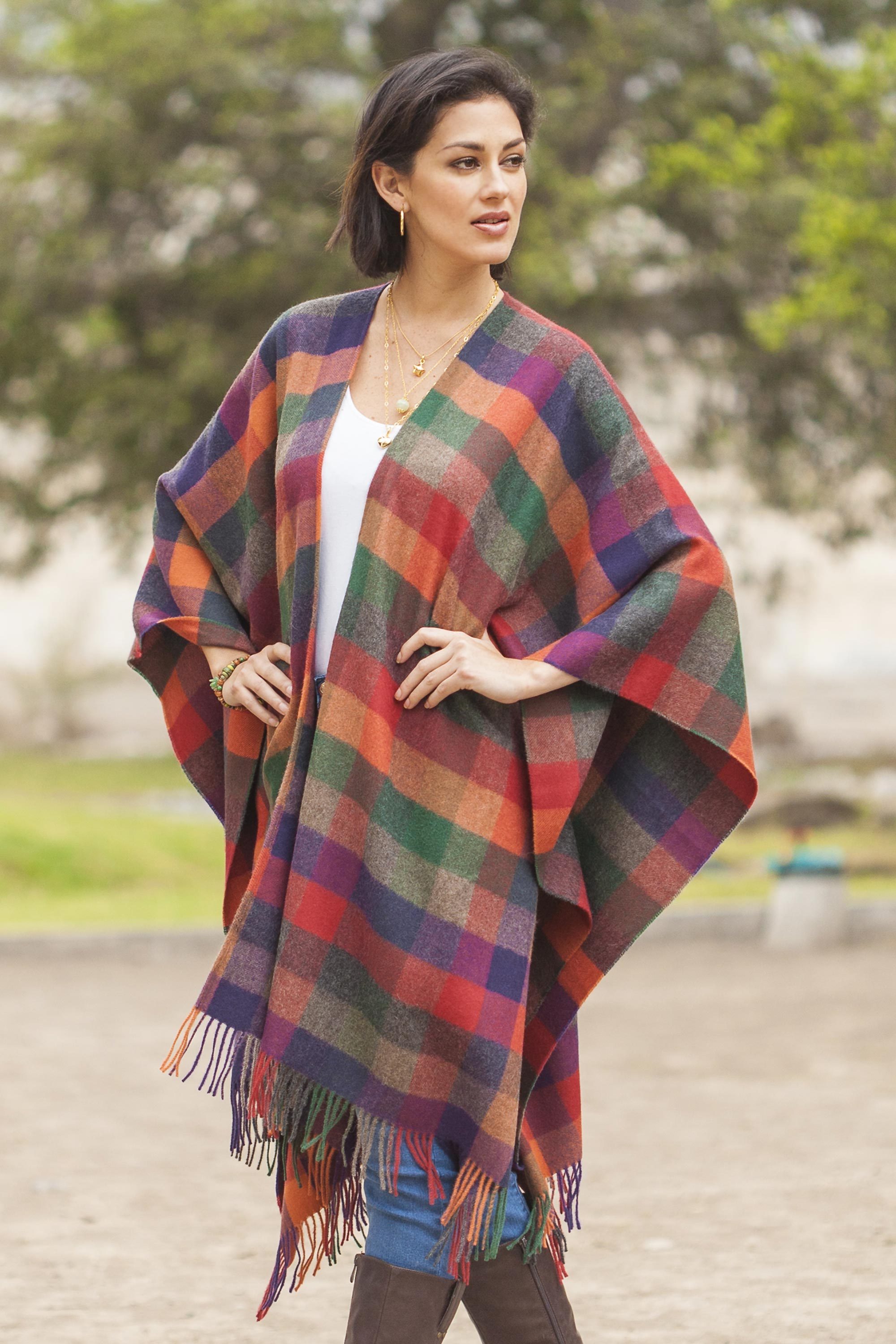 Multicolored Checked 100% Baby Alpaca Ruana from Peru, 'Colorful Checks'