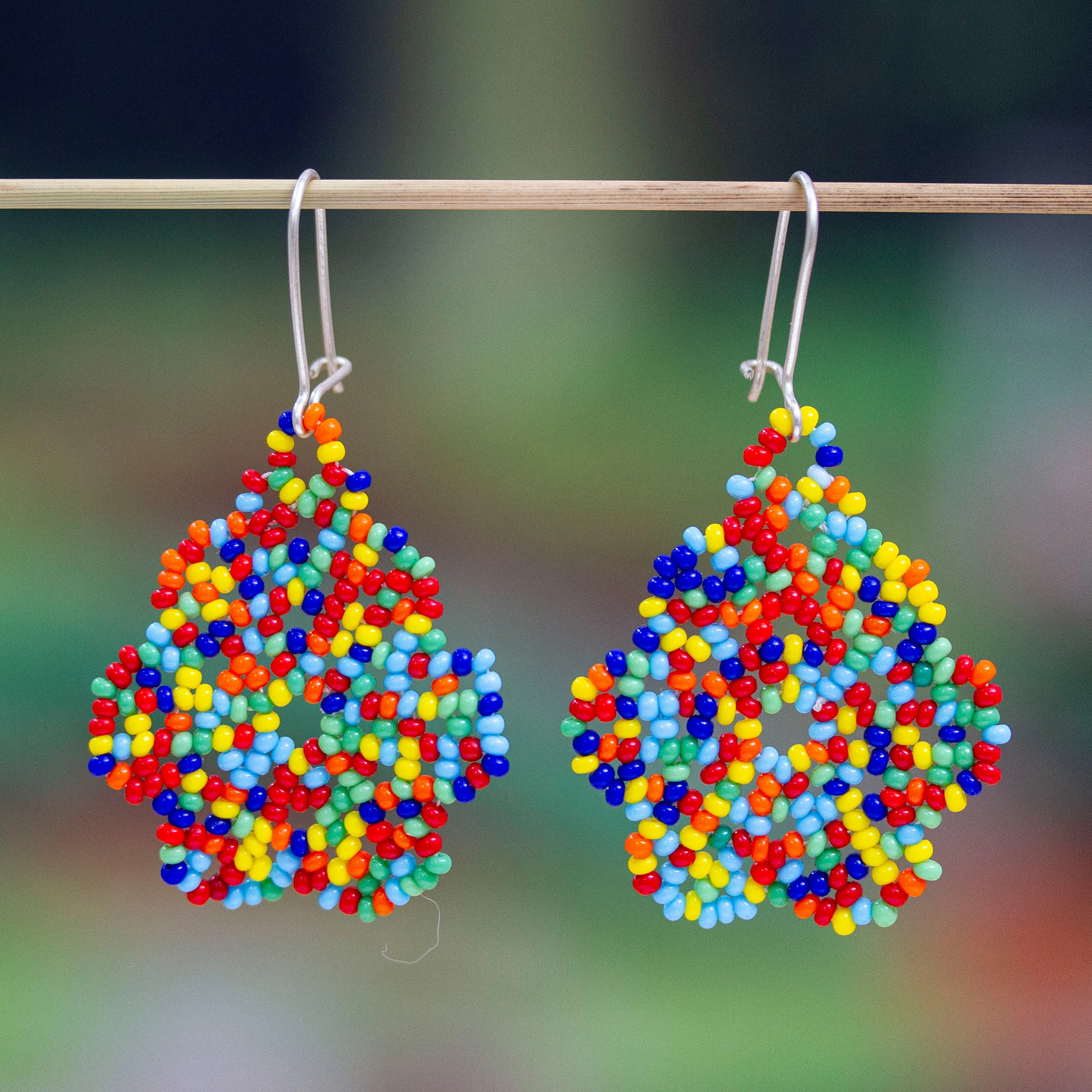Adriana Trejo crafts bright and cheerful earrings that combine with everything. She works with tiny glass seed beads, placing them one at a time, and displaying the medallions on sterling silver hooks.