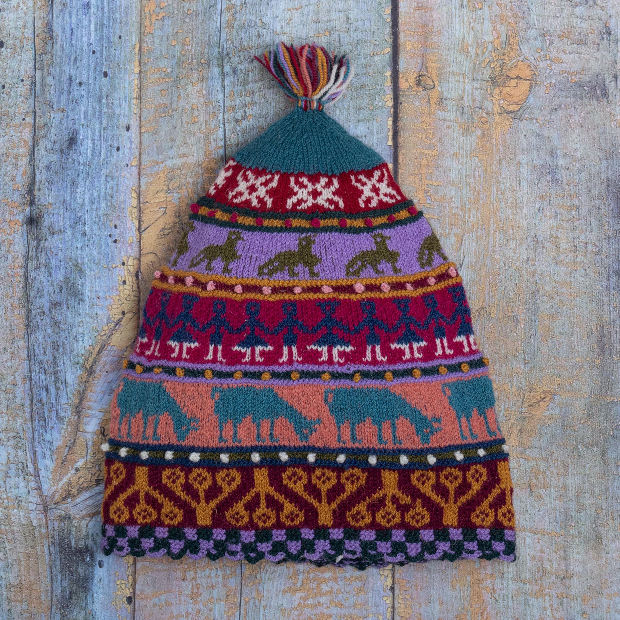 Knit entirely by hand, this cozy hat will be a bright addition to your winter wardrobe. The artisans of Hilando Victoria craft the hat from pure wool yarns in cheerful colors, incorporating motifs inspired by the traditional Qanchi dance which pays homage to Pachamama, or Mother Earth.