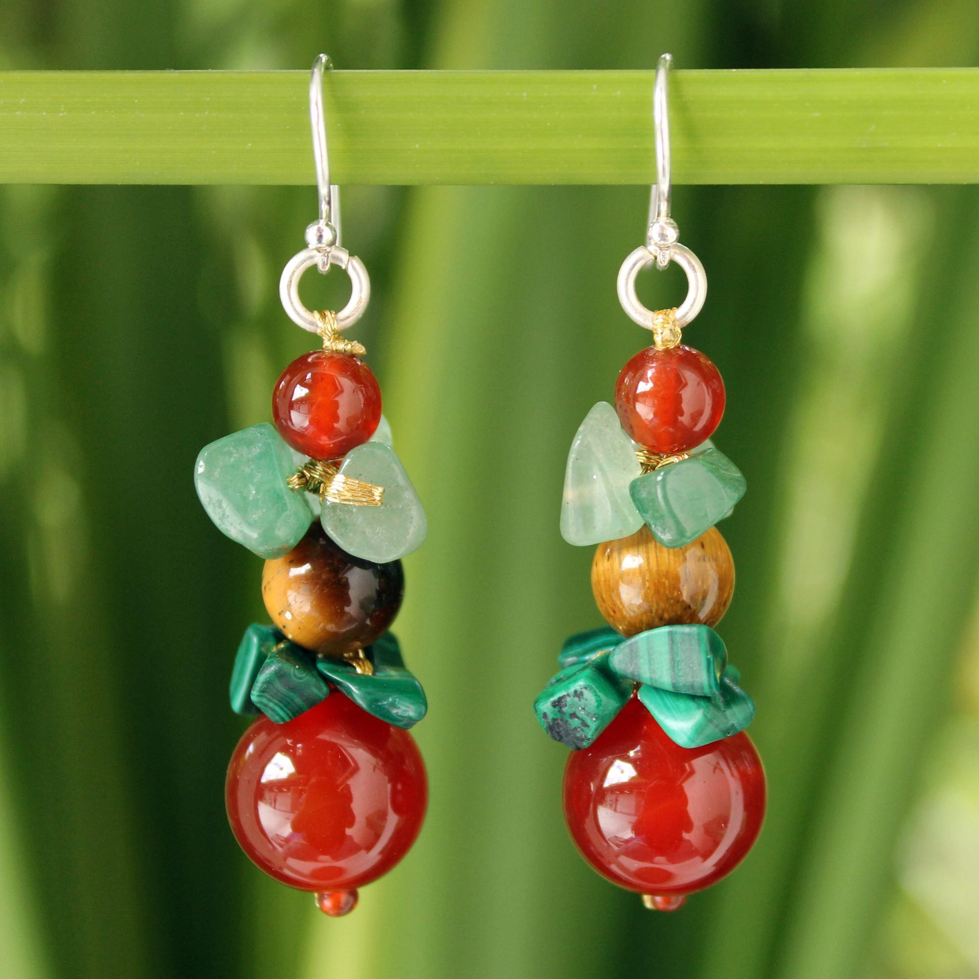 Designed by Sasina in Thailand, these earrings display an array of colorful gems. Carnelian, tiger's eye, malachite and quartz dangle enticing from sterling silver hooks. This playful set adds the perfect accent for bold attire.