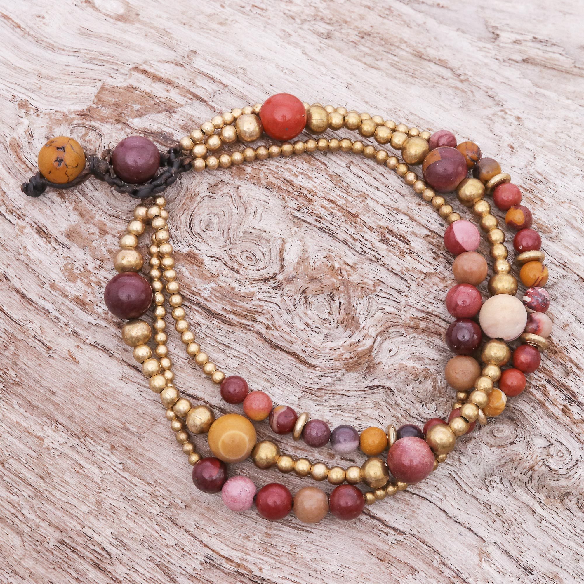 Working with jasper beads in red, wine, mauve, orange and ochre shades, Tiraphan Hasub in Thailand creates this pretty bracelet. The gemstone beads are complemented by golden brass beads in the multistrand design.