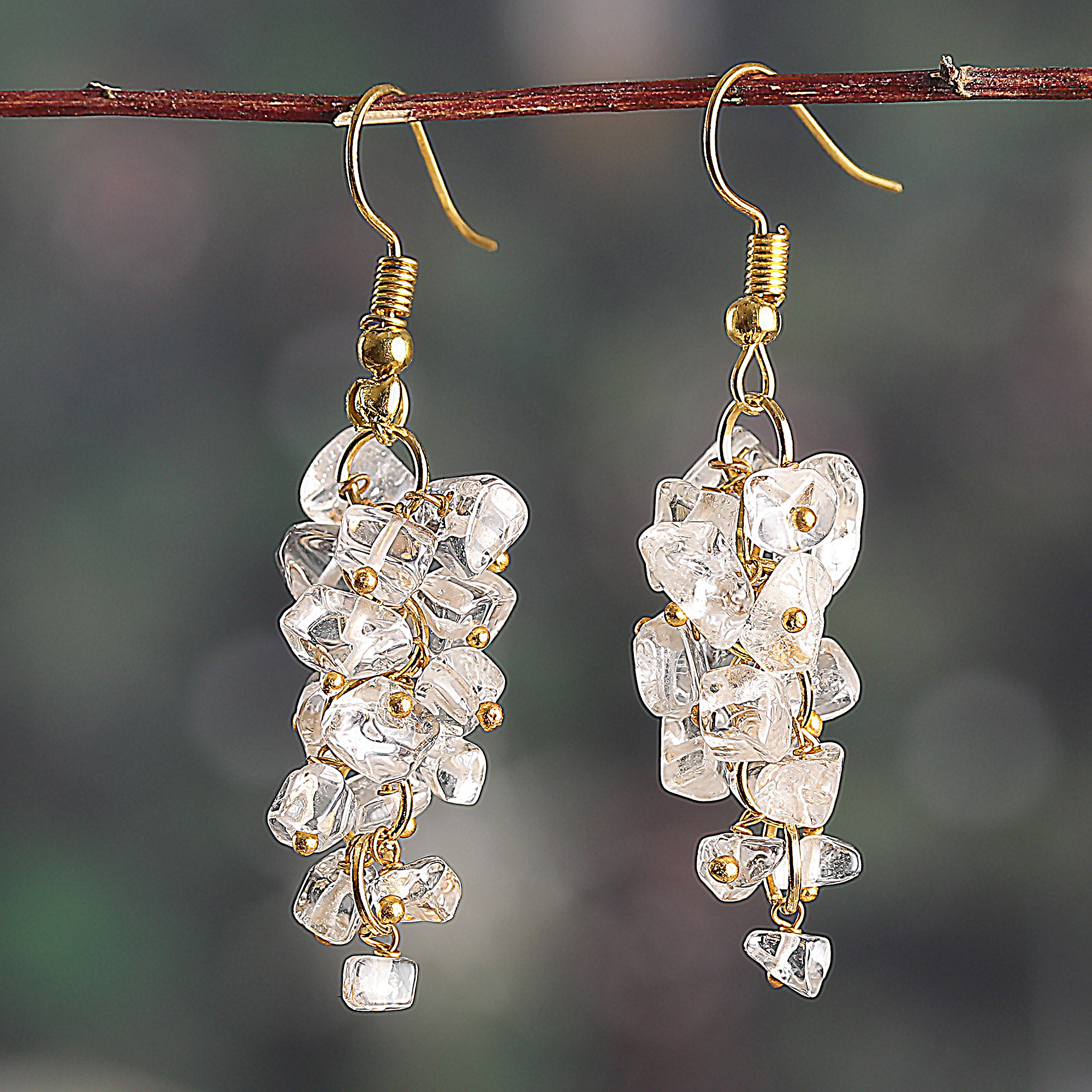 Let a cluster of heavenly clear quartz gems take you on an adventure of boho style and serene sensations. Designer Swasti Jain of India teams up with local artisans to create these cluster earrings, whose electrophoretic lacquered iron wires reunite each jewel in a beautiful arrangement that evokes the beauty of an ethereal world.