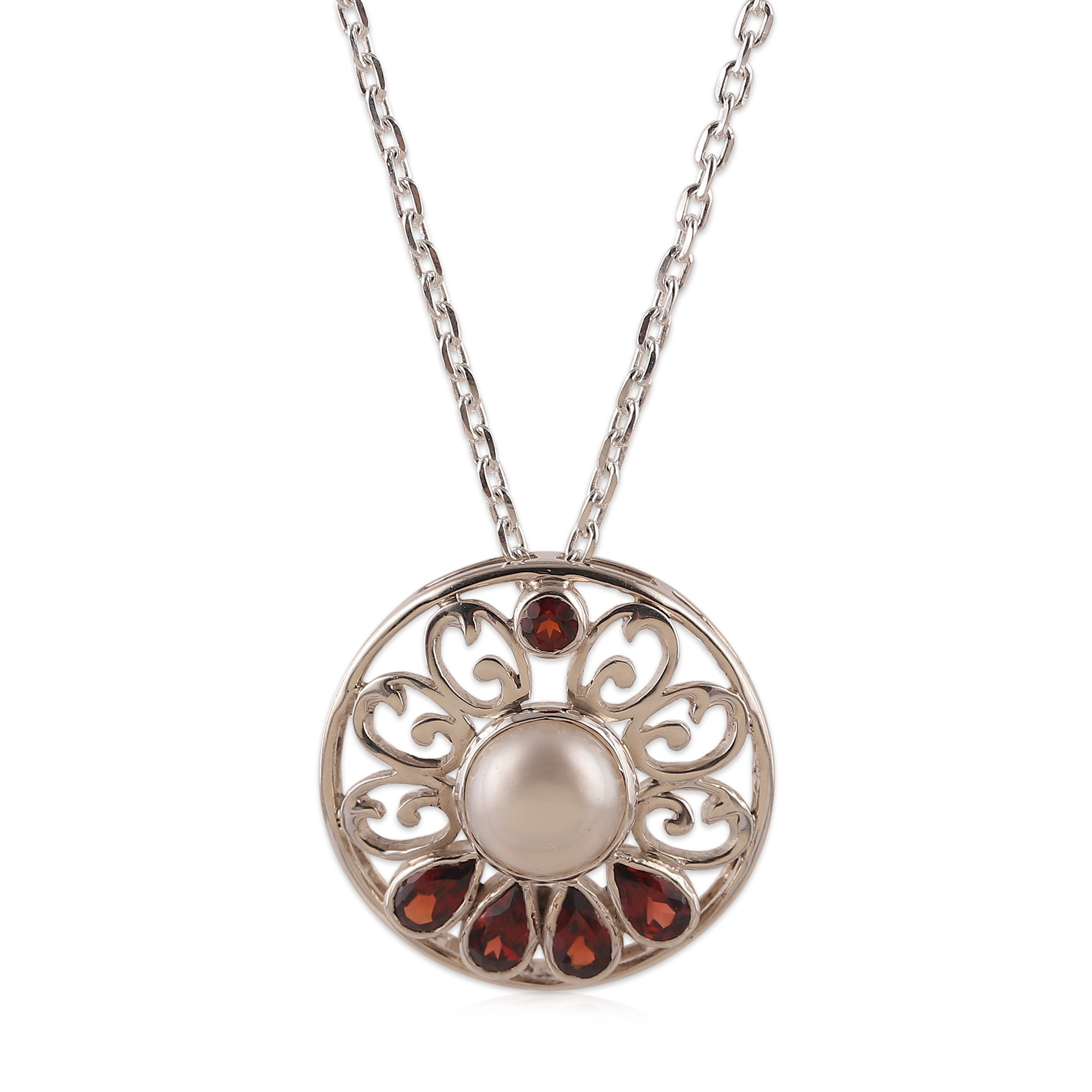Natural pearls and garnet jewels are the seeds for a style rich in romantic vibes. Designer Shubhra Singh of India works with a talented team to craft this sterling silver jewelry set, composed of a necklace and dangle earrings of floral enchantment. Inspired by spring, the set totals one carat, letting their natural cream and crimson hues shine alongside a polished finish.