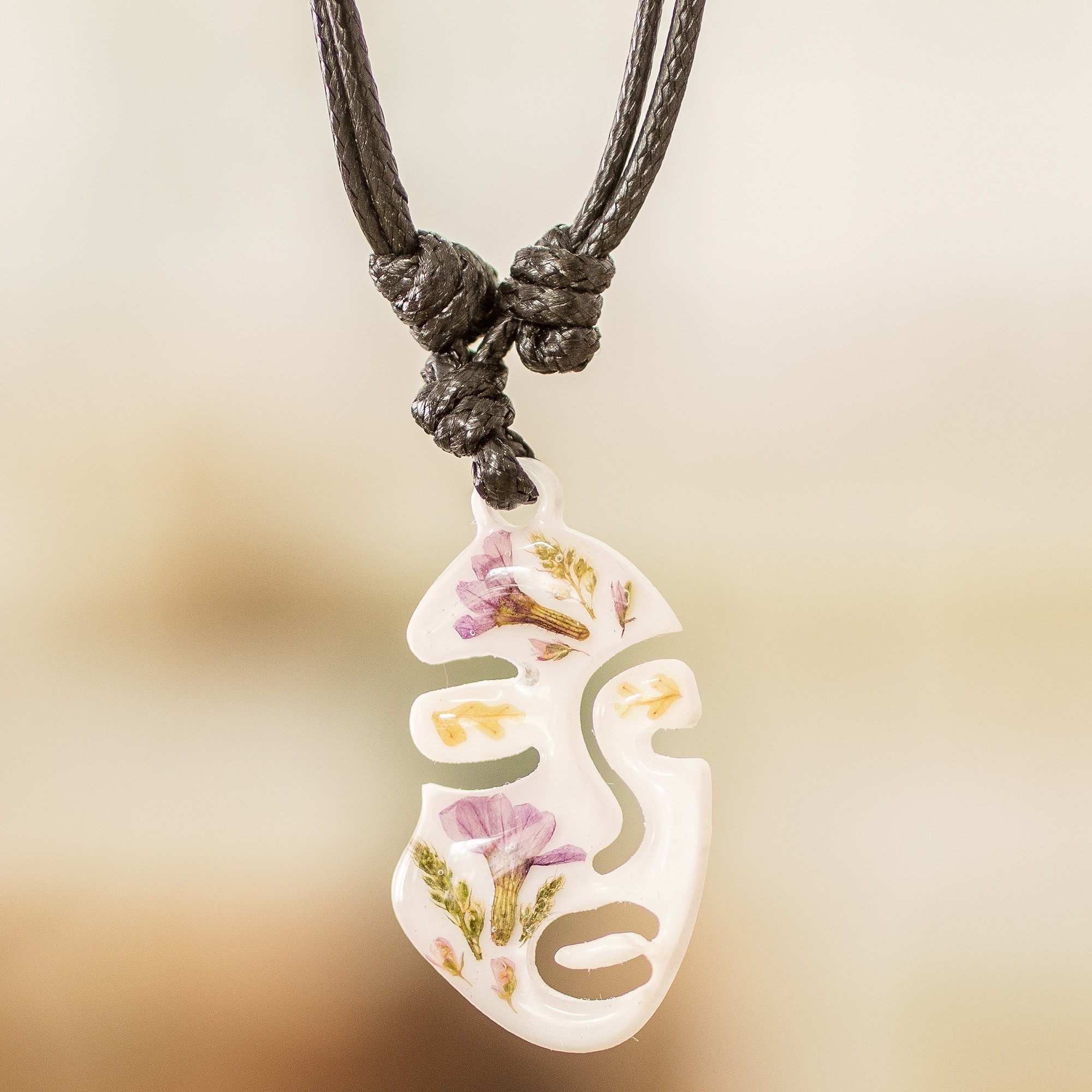 Gracious sinuous formations enhance the sweet beauty of the natural flowers and leaves resting inside this resin pendant necklace. Capturing spring's tender aura, Costa Rican artisan María Durán crafts the accessory on a white base hue, adding an adjustable black cord for an easy fit.