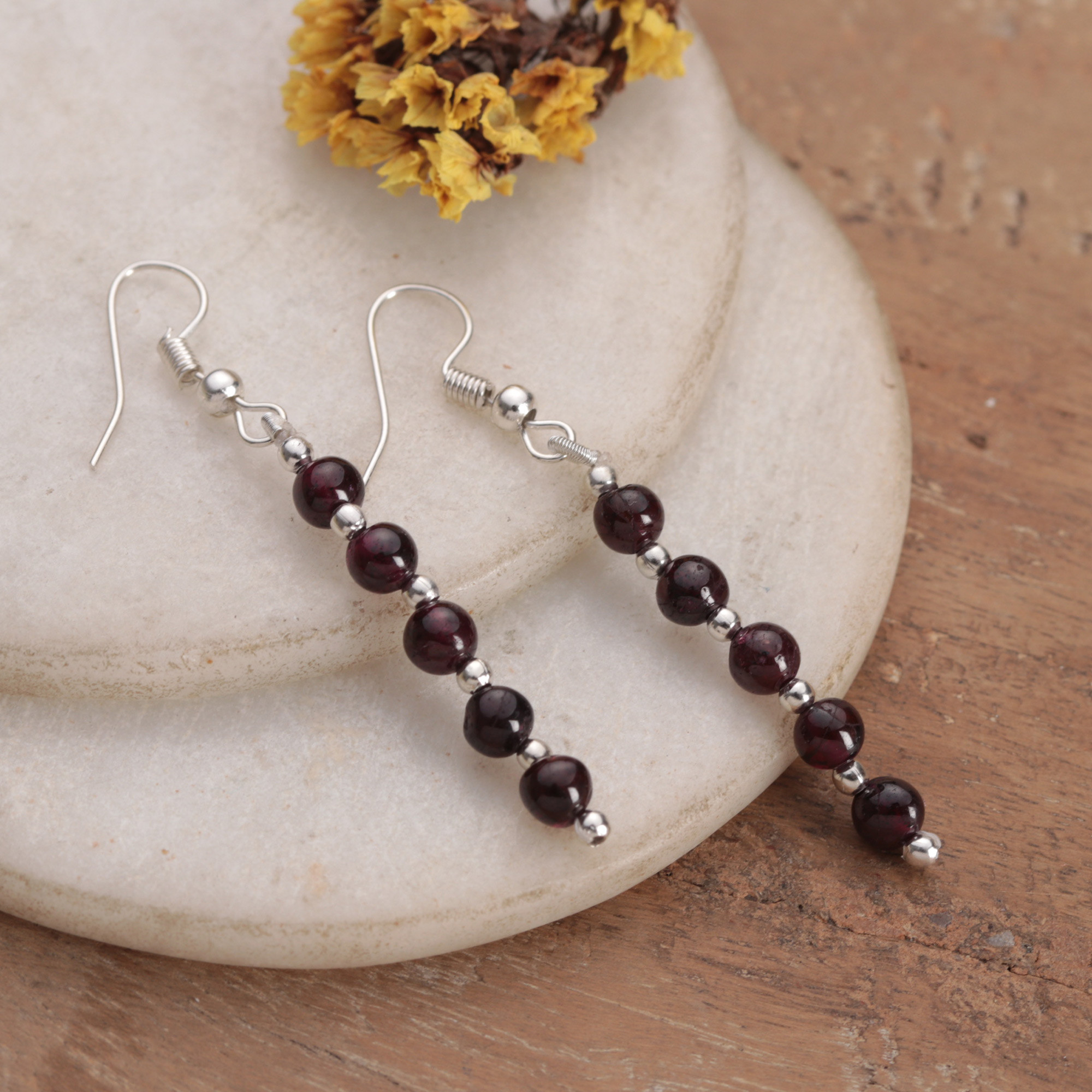 Natural Garnet and Cotton Threads Beaded Dangle Earrings, 'Distinguished Crimson'