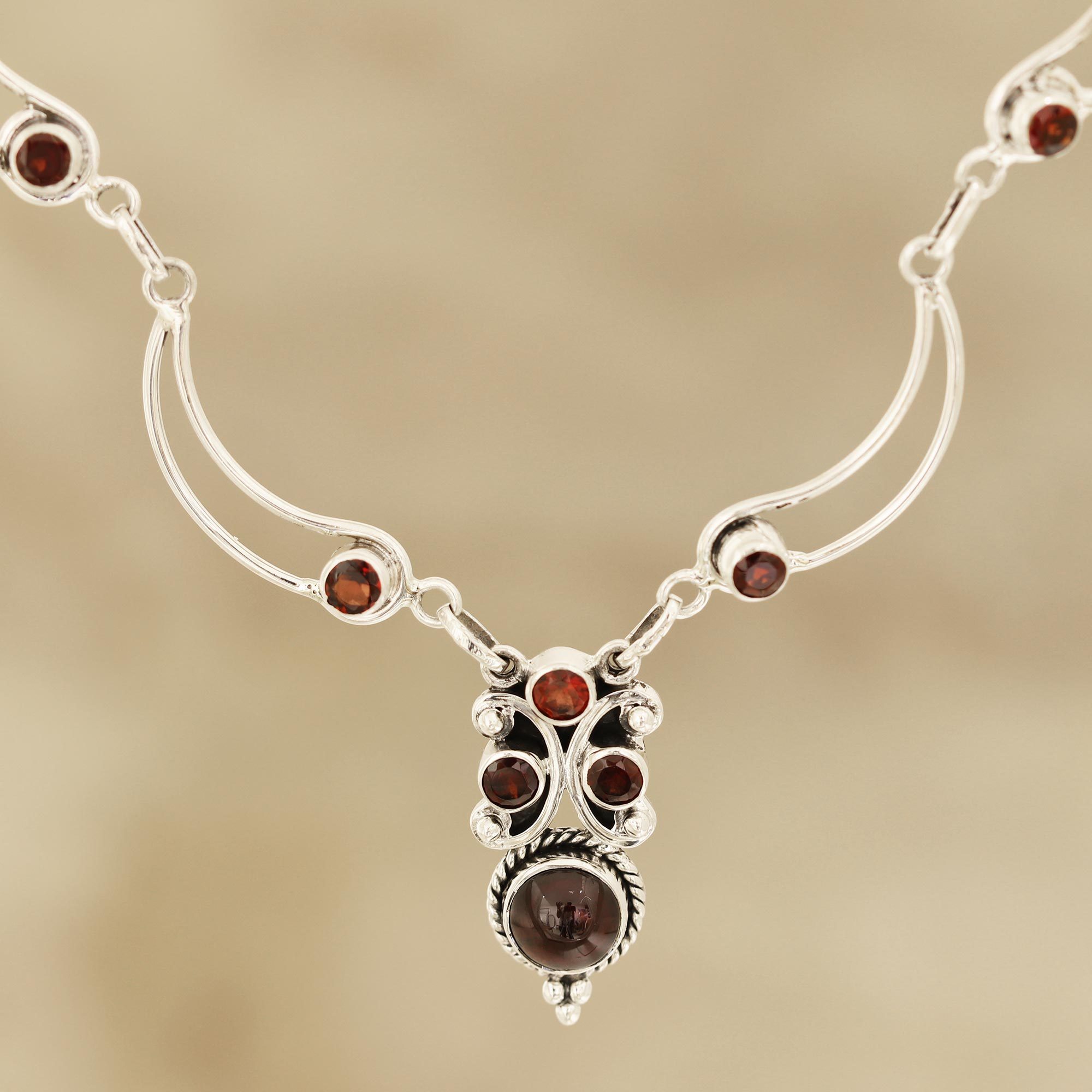 Petite faceted stones of natural garnet flank a single gleaming garnet cabochon. India's Neeru Goel presents a beautiful pendant necklace, which features handcrafted sterling silver motifs that surround the stones for a truly regal look.