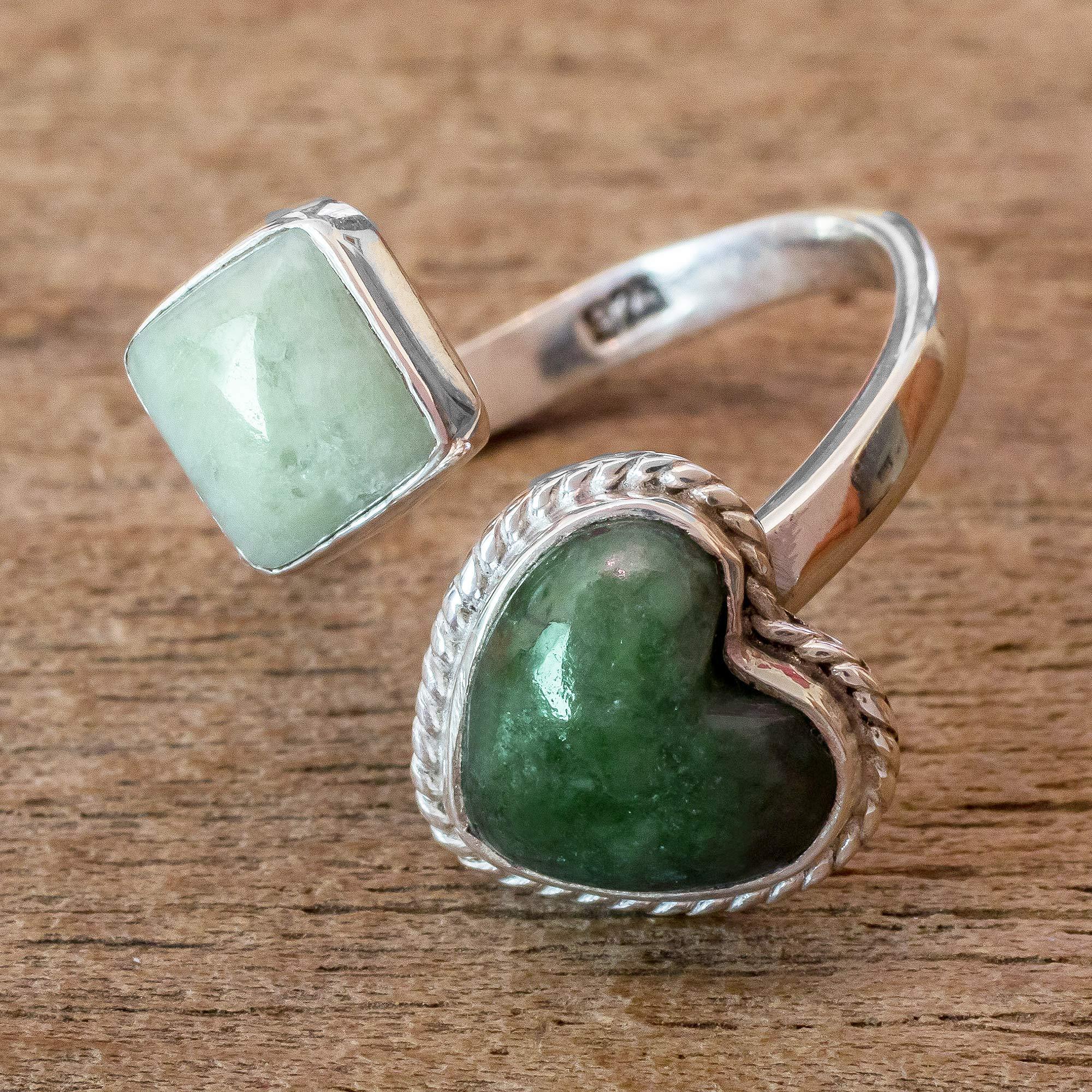 Medium and light green Guatemalan jade make a pretty combination in this wrap ring from Victoria Zurdo. The artisan sets the square and heart-shaped gemstones in sterling silver bezels, one plain and one with a rope-edged detail.