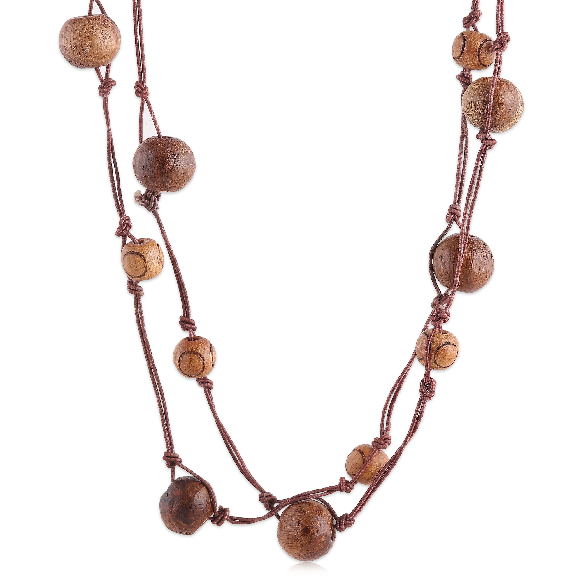 Natural Haldu Wood and Brown Cotton Beaded Station Necklace, 'Sylvan Planets'