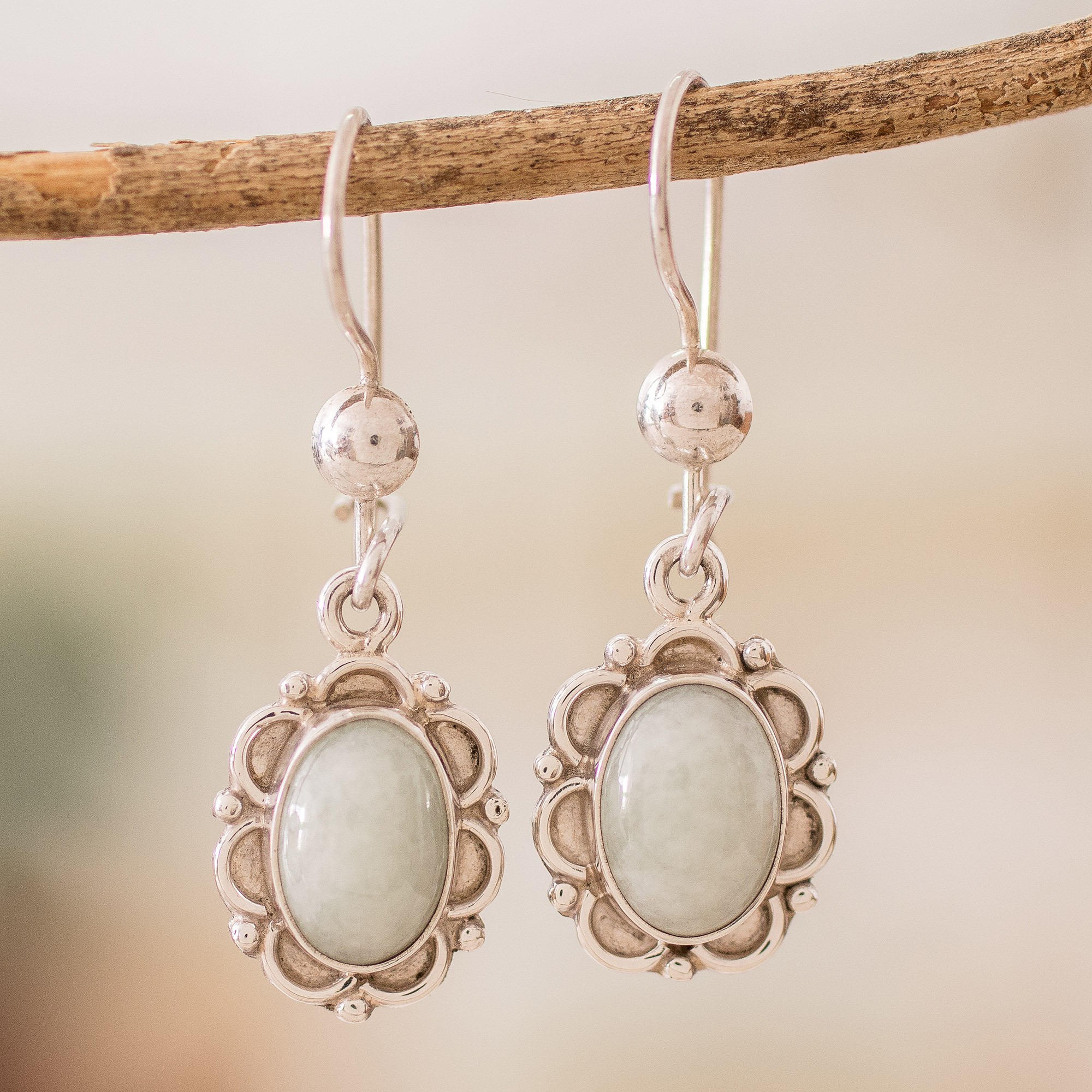 These handcrafted pale green stones set in sterling silver serve as a reminder of ancient beliefs. Created by Zandra Lorena Sajbin, these delicate earrings express the Maya mystery that three jade stones separated the sea from the sky. Natural stones are highlighted by a floral outline to enhance their beauty.