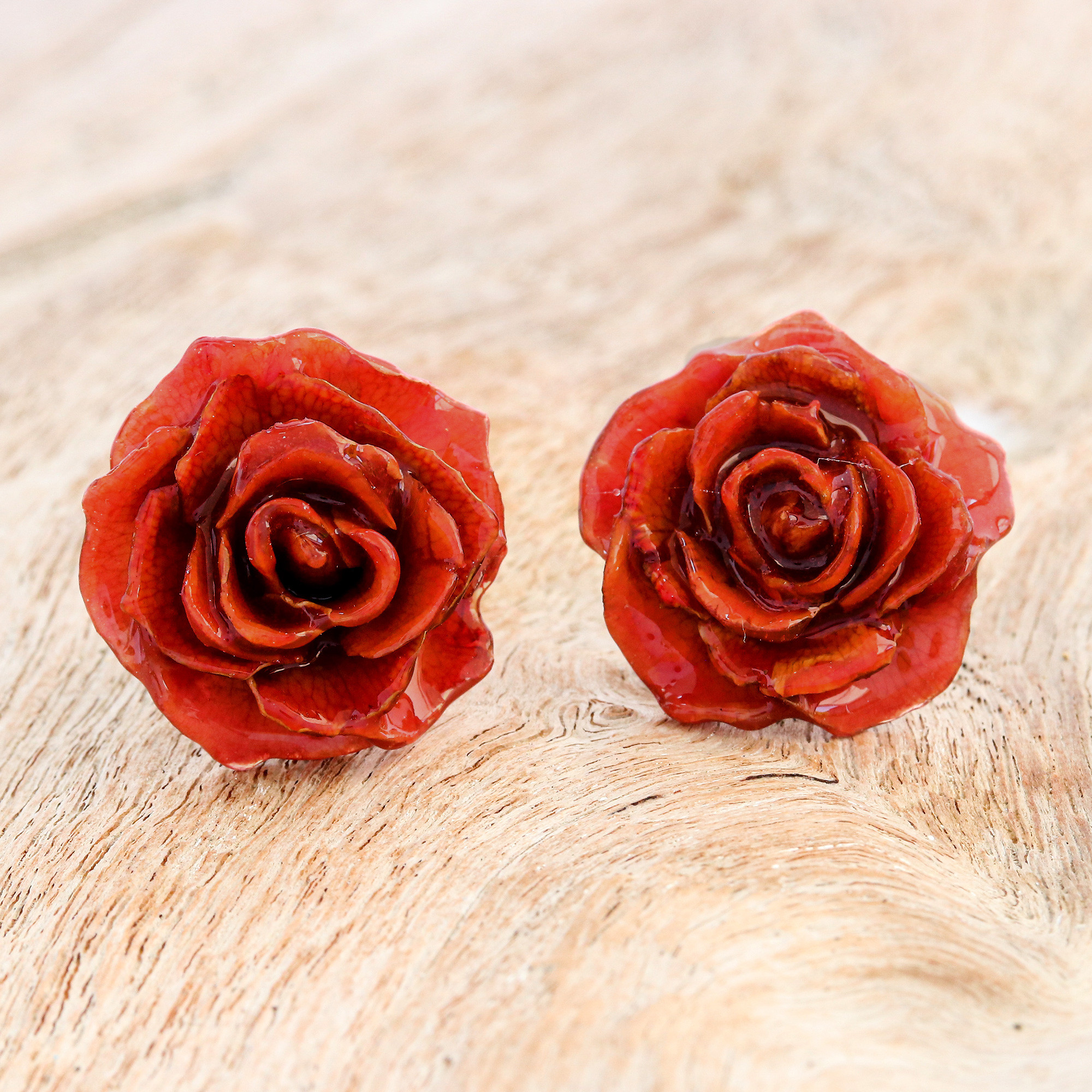 Natural Rose Button Earrings in Red from Thailand, 'Flowering Passion in Red'