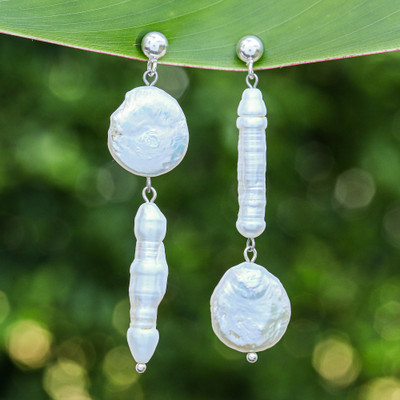 Natural white hues and heavenly vibes create a new world, by Thailand's Somluck Komolmith. Cultured pearls, in elongated and coin shapes, compose an ethereal illusion for these dangle earrings, which you can easily wear thanks to the designs' comfortable sterling silver hooks.