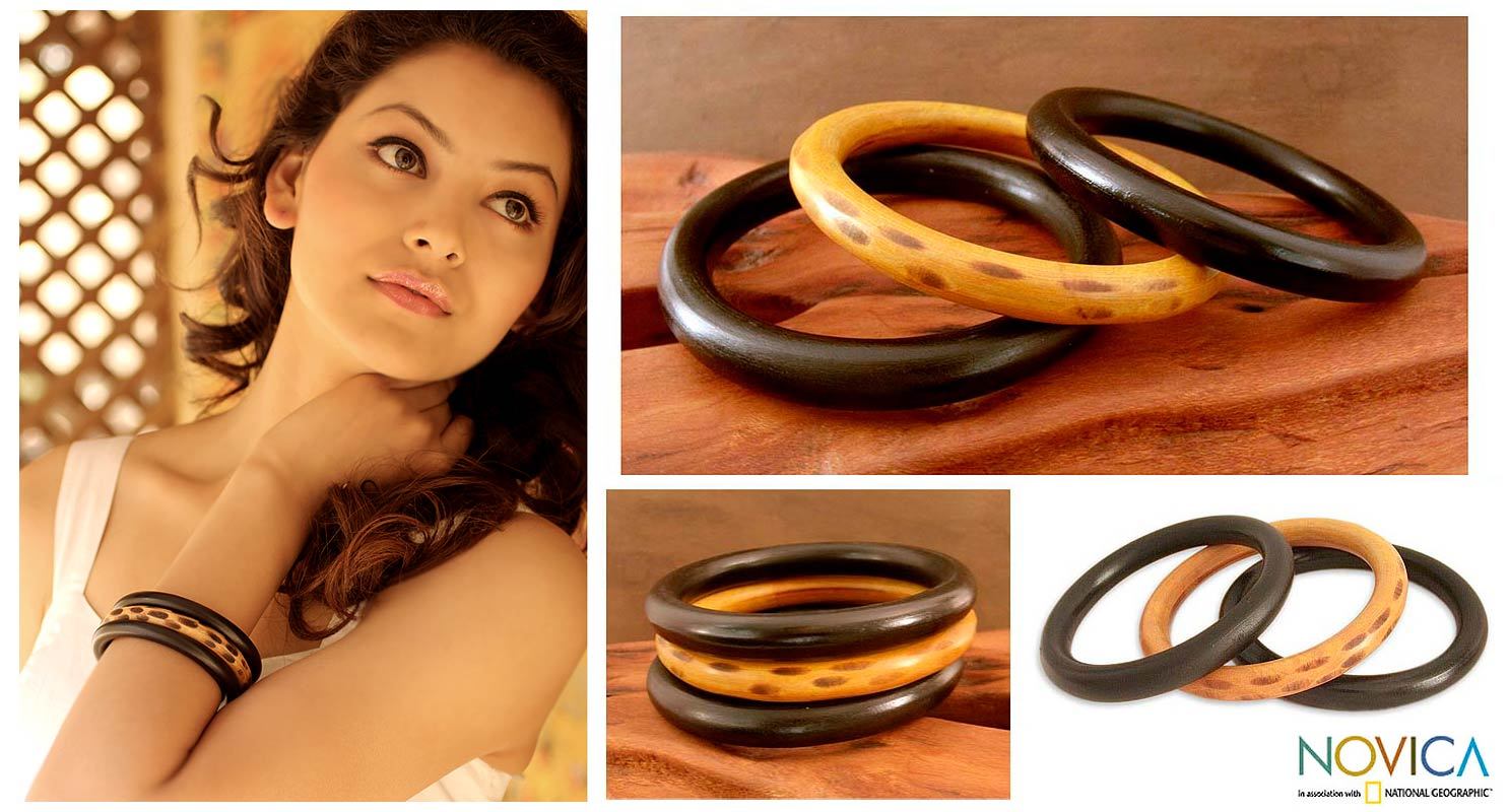 These bangles accessorize with bold, exotic elegance. From Vipin, each bracelet is carved by hand from Indian acacia wood. In this set of three, one is light brown with darker spots, and two are black.