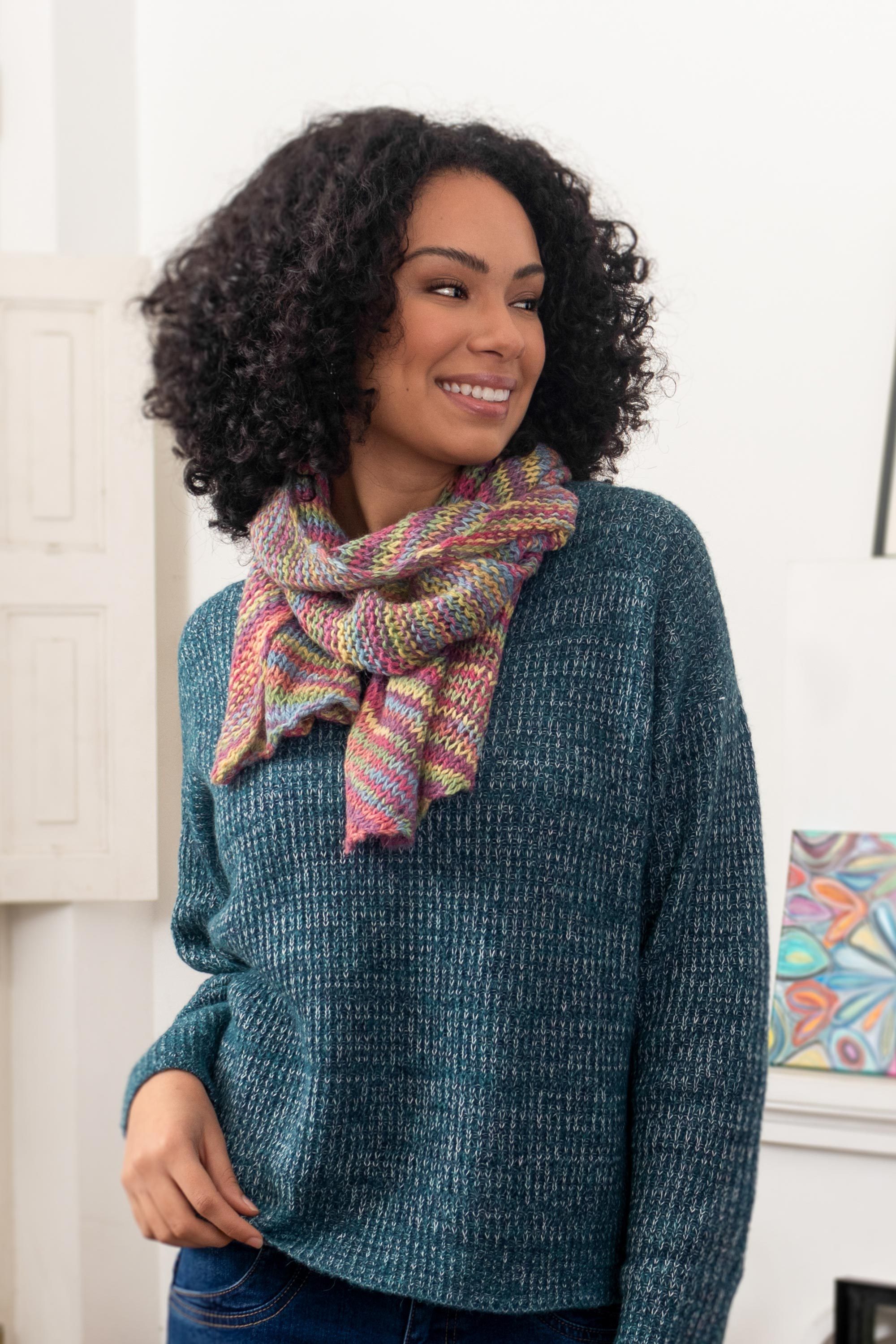 A variety of vibrant colors decorate the length of this scarf, knit from alpaca wool by Andean artisans. Maria Teresa Tejada works with only natural colors made from plants to achieve the rainbow patterns on the shawl for a beautiful testament to the excellence of Peruvian textiles. This eco-friendly companion is sure to be noticed wherever it goes.