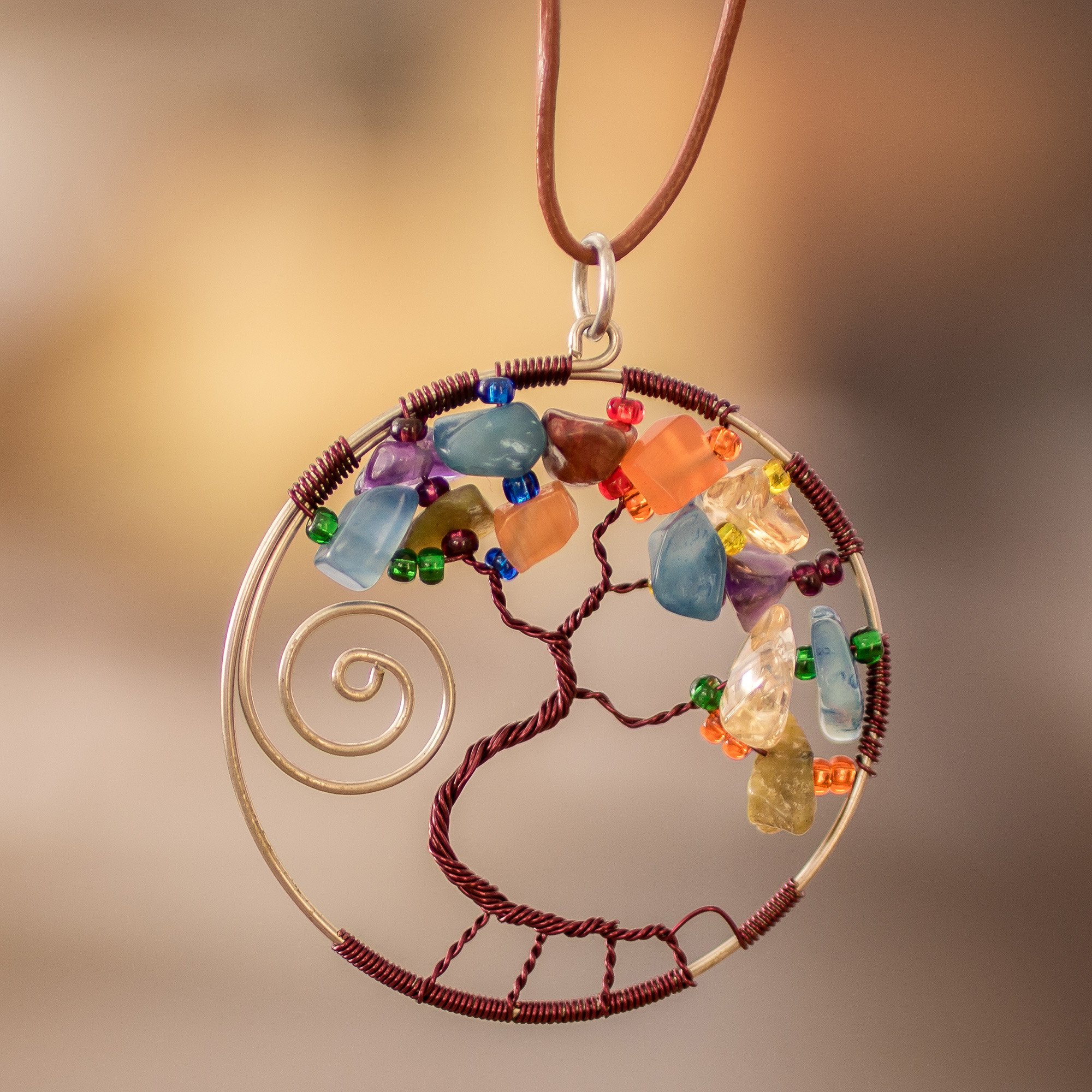 Artisan Domingo Reanda wishes for the world to grow as prosperous and strong as the tree that decorates his newest creation. Made in honor of nature, this stainless steel pendant necklace features a gorgeous nature theme embellished with brown wires and a combination of jasper, citrine, quartz, amethyst, glass and crystal beads, whose vibrant hues invite you to let your inner nature flourish. The necklace—directly from Guatemala—also comes with a comfortable leather cord.