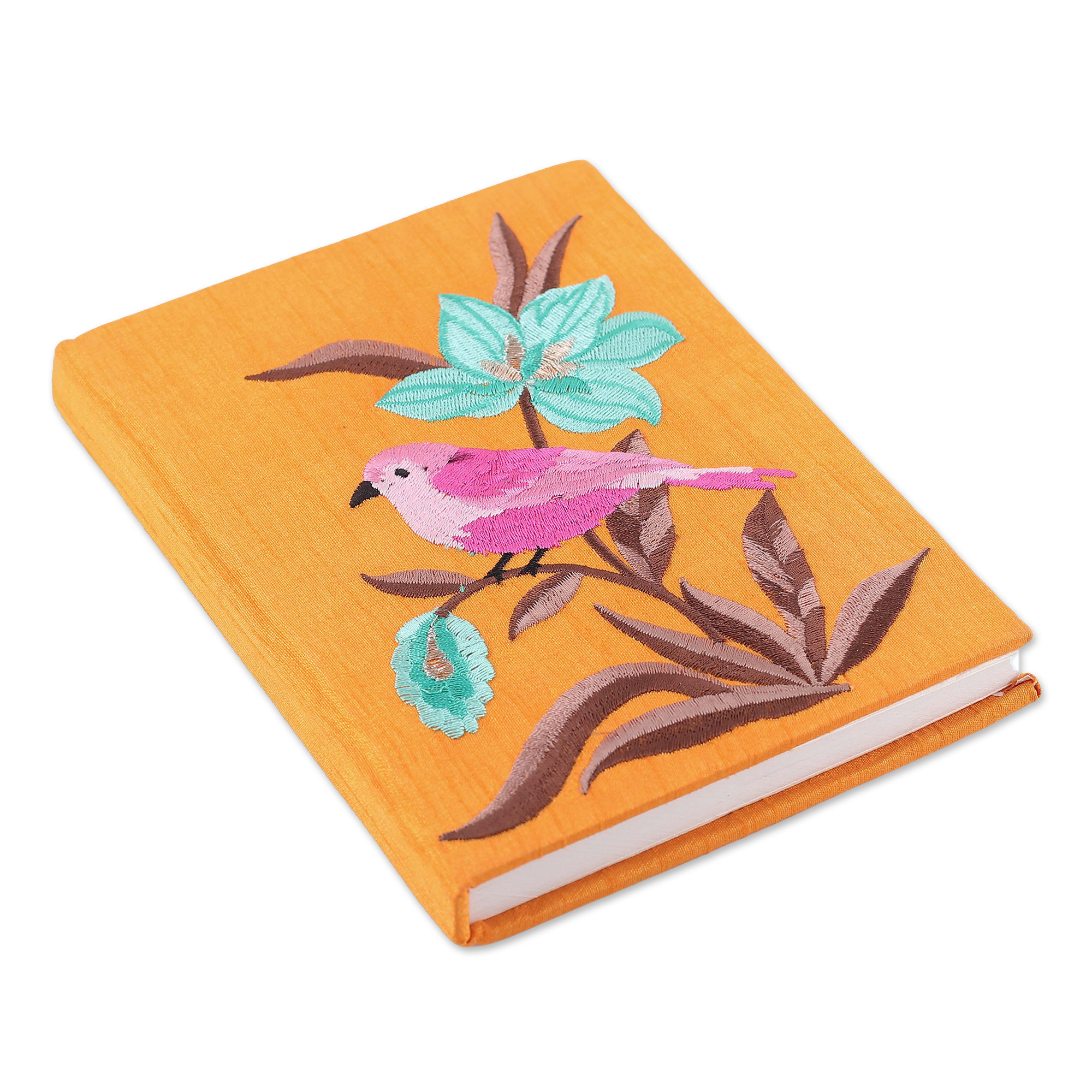 A tale from nature spreads its wondrous beauty in this 57-page handmade paper journal by Asha Prabha's artisan team. Rayon threads decorate the cover with a lovely embroidered scene, where flowers and a bird await to see your written adventures. Made with unlined pages, the journal has a cotton binding.