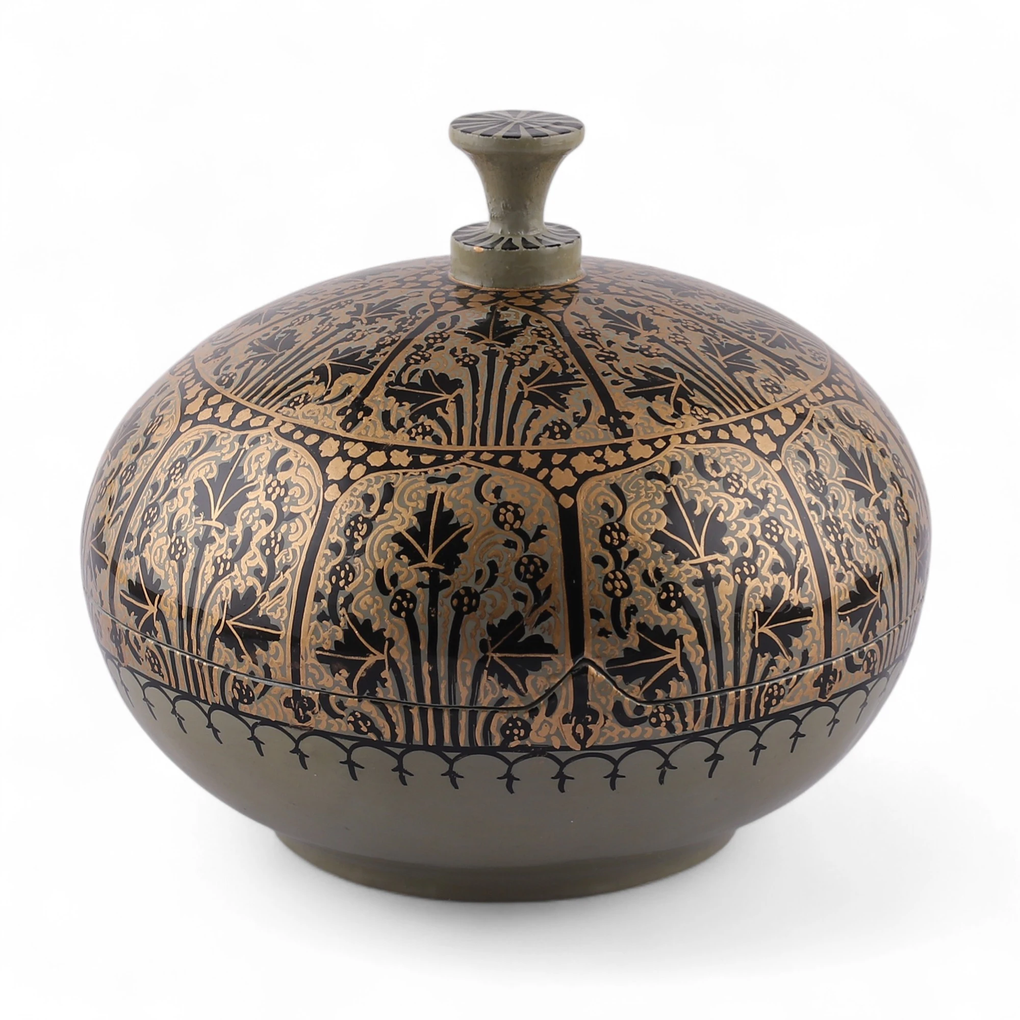 The Kashmir artistry portrays nature in an exquisite pattern of leafy shadows and golden lines. Artisan Fida Hussain works on weeping willow wood to craft this distinguished decorative box of Indian inspiration, as its details follow the characteristic accents of the region's high-quality artworks. Made with papier mache and painted by hand, the piece has a convenient lid.