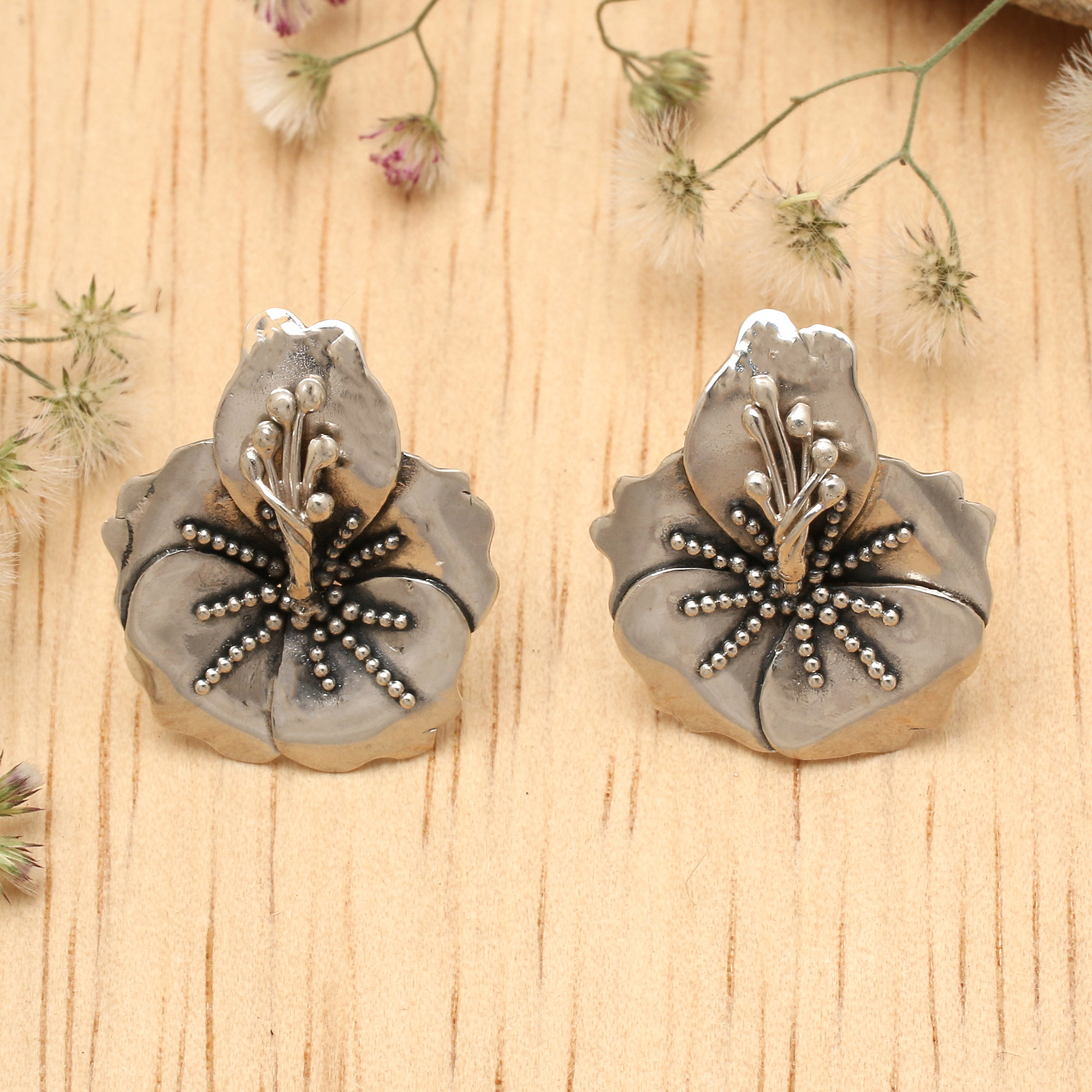 Nature-Themed Sterling Silver Hibiscus Bloom Button Earrings, 'Eternal Hibiscus'