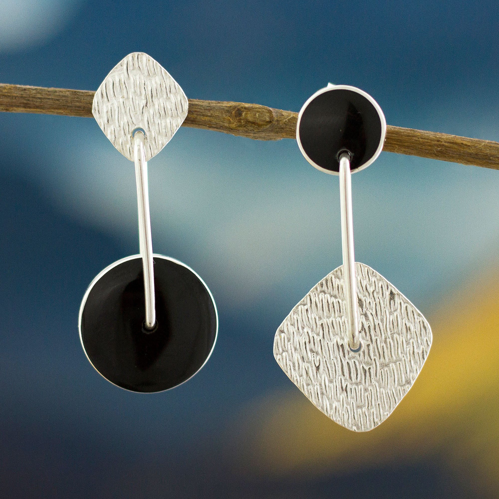 Make a statement in obsidian and sterling silver with this pair of dangle earrings designed by Patricia Jara of Peru. One earring features a large circle of smooth obsidian, set in sterling silver, that hangs from a rounded diamond shape of textured sterling silver. The other earring has the same elements in reverse—a smaller obsidian circle supports a large rounded diamond of textured sterling silver.