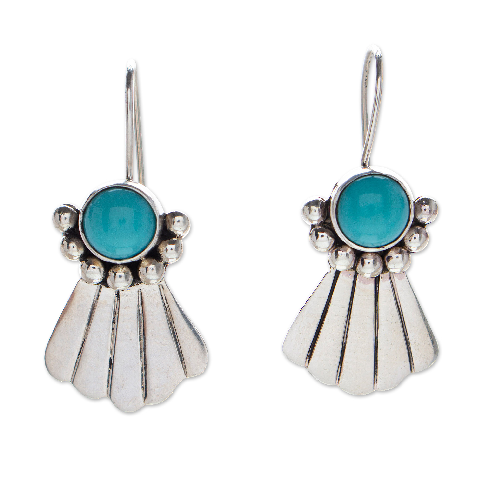 Dive deep into the ocean's magical aura with a gorgeous design crafted in Mexico. Artisan Roy Nilson uses advanced techniques to craft these sea-themed dangle earrings from sterling silver, creating seashell-shaped structures adorned with little beads and natural turquoise stones as a representation of hope.