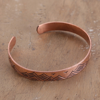 The majesty of India's artistry immortalizes a sea of glamorous sensations. Artisan Sumit Dhawan works with copper to create this cuff bracelet, whose band has a captivating seascape scene embossed—combining polished and oxidized finishes.