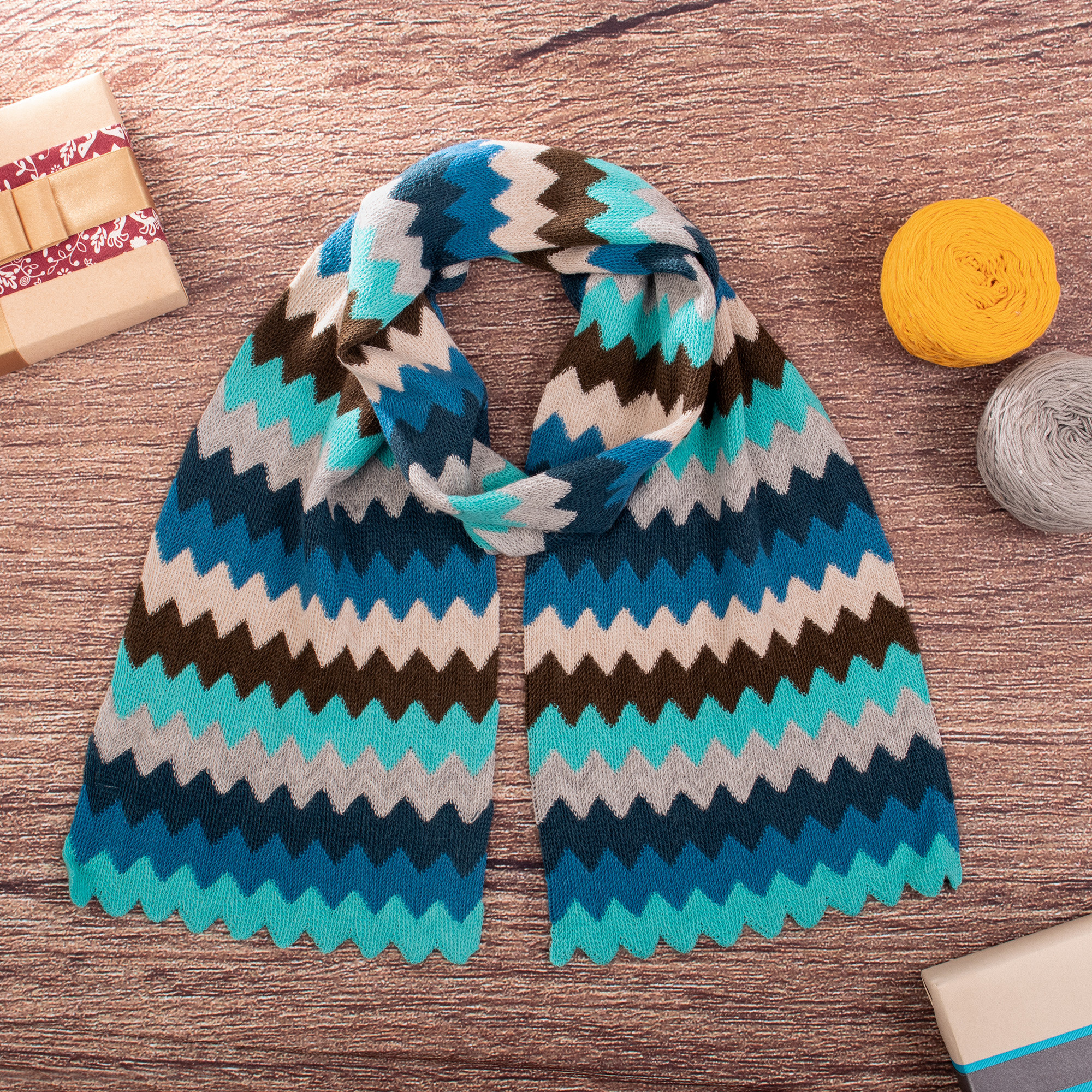 In oceanic hues of cerulean, teal, pearl grey, olive, espresso and white, mesmerizing zigzag patterns decorate this scarf from Peru. Alfredo Falcon designs this scarf, which he knits from a soft alpaca wool blend.