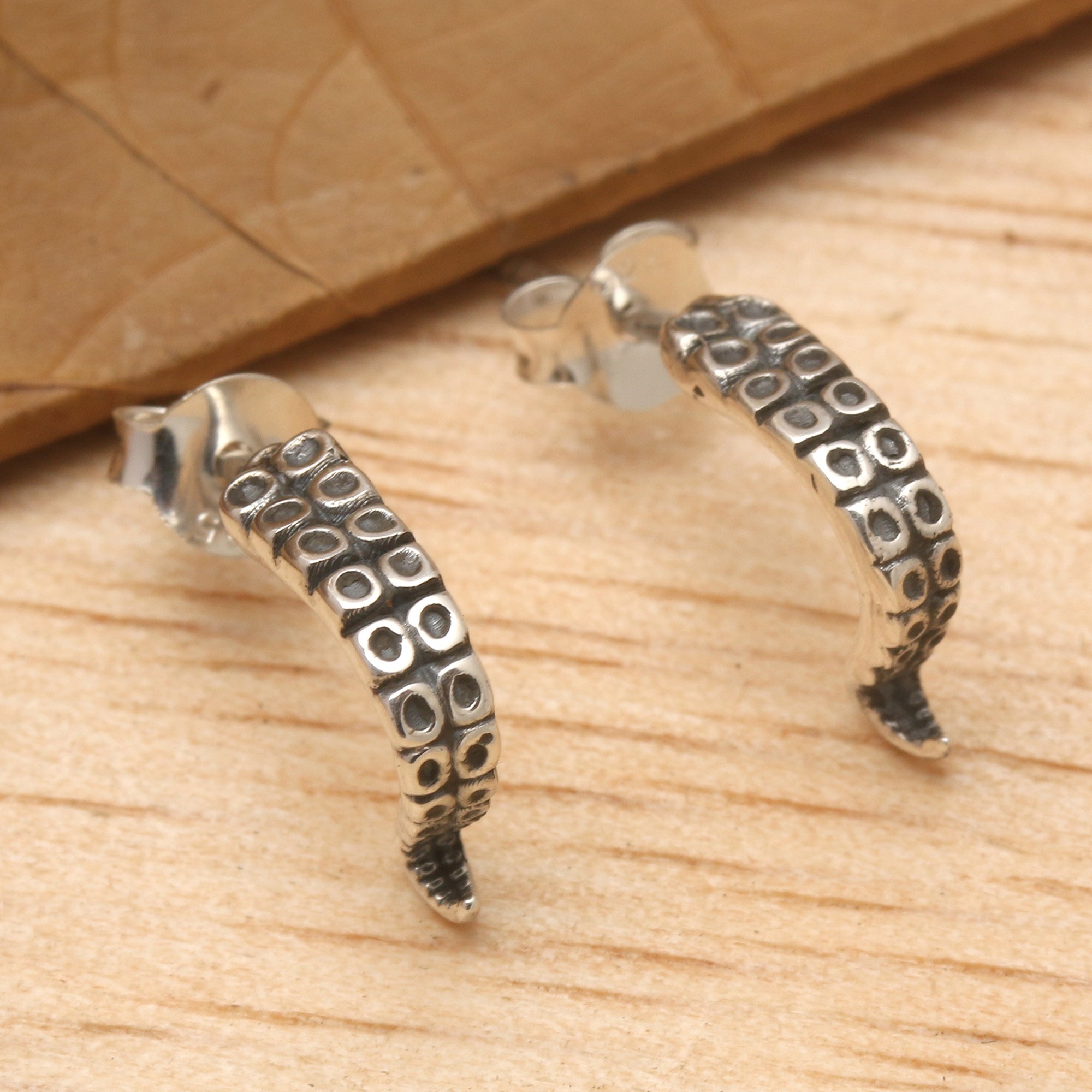 Octopus-Themed Sterling Silver Button Earrings from Bali, 'Octopus Greetings'