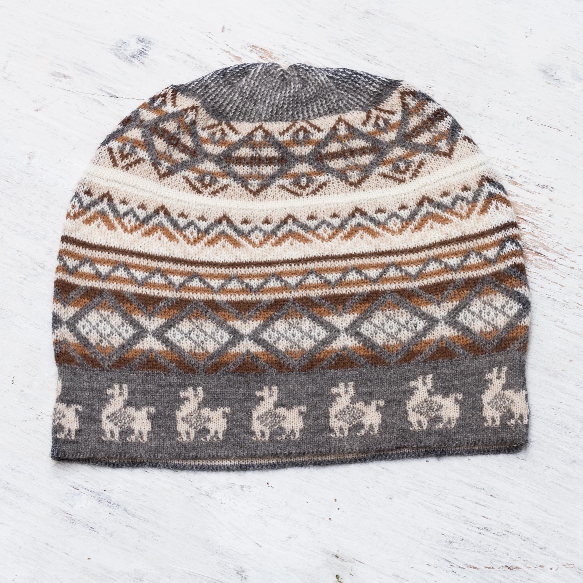 Off-White Brown and Grey Diamond Motif Alpaca Blend Knit Hat, 'Alpaca Mountain'