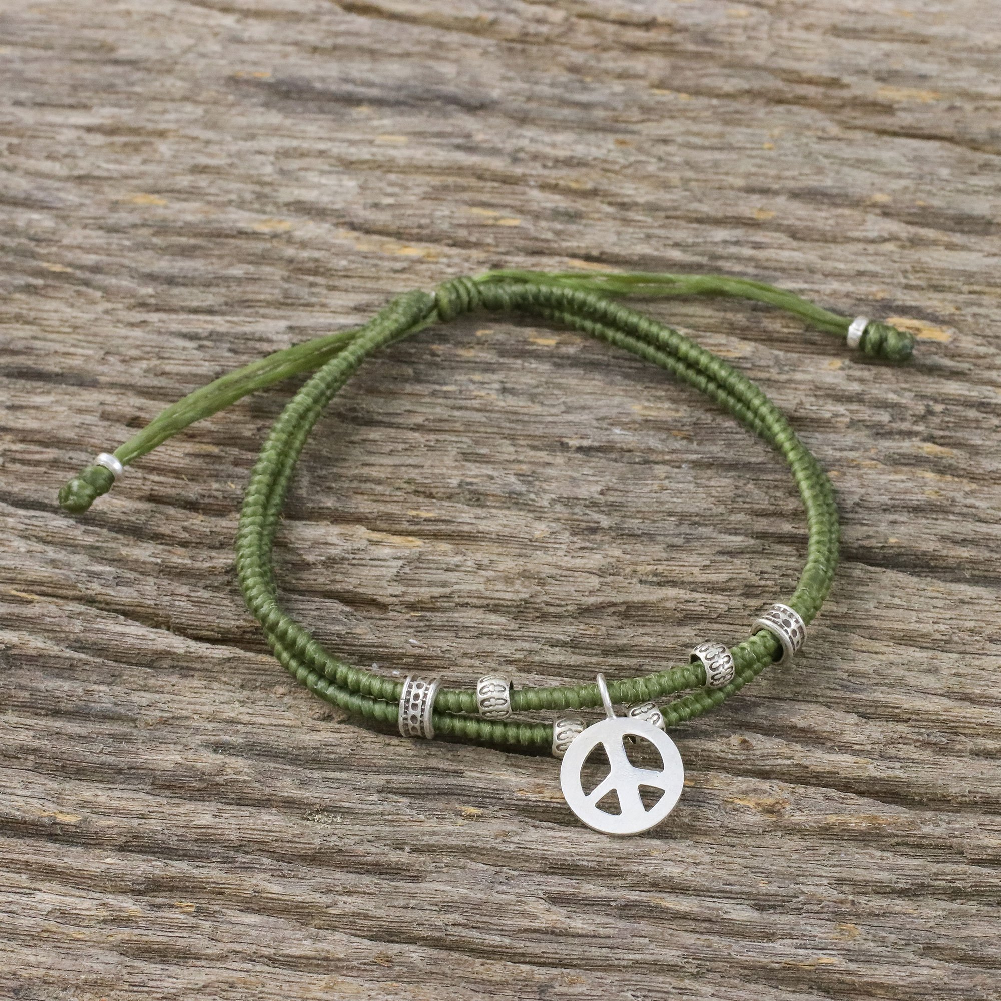 Olive-hued cords, braided by hand, are accented with petite beads of 950 silver that have been hand-stamped by Karen hill tribe artisans. Artisan Napapat from Thailand presents the unisex bracelet, which features a silver peace symbol charm. The perfect fit can be achieved by adjusting the bracelet's length with the sliding knot.