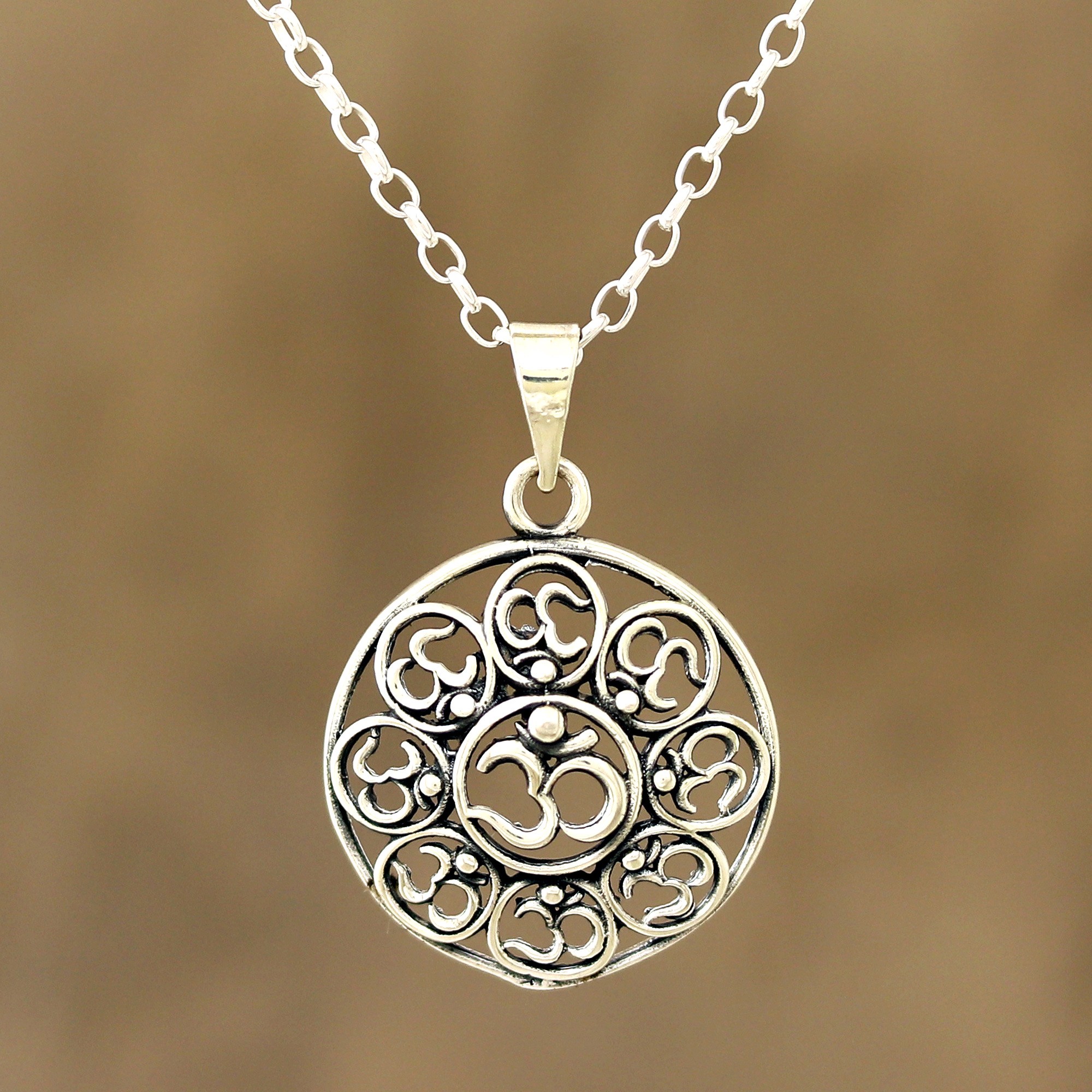 Carrying a promise of eternal peace, this pendant necklace from India is designed by Shivani Choudhary. She works with local artisans, who craft the pendant from sterling silver to feature intricate openwork om symbols, promoting thought and meditation.