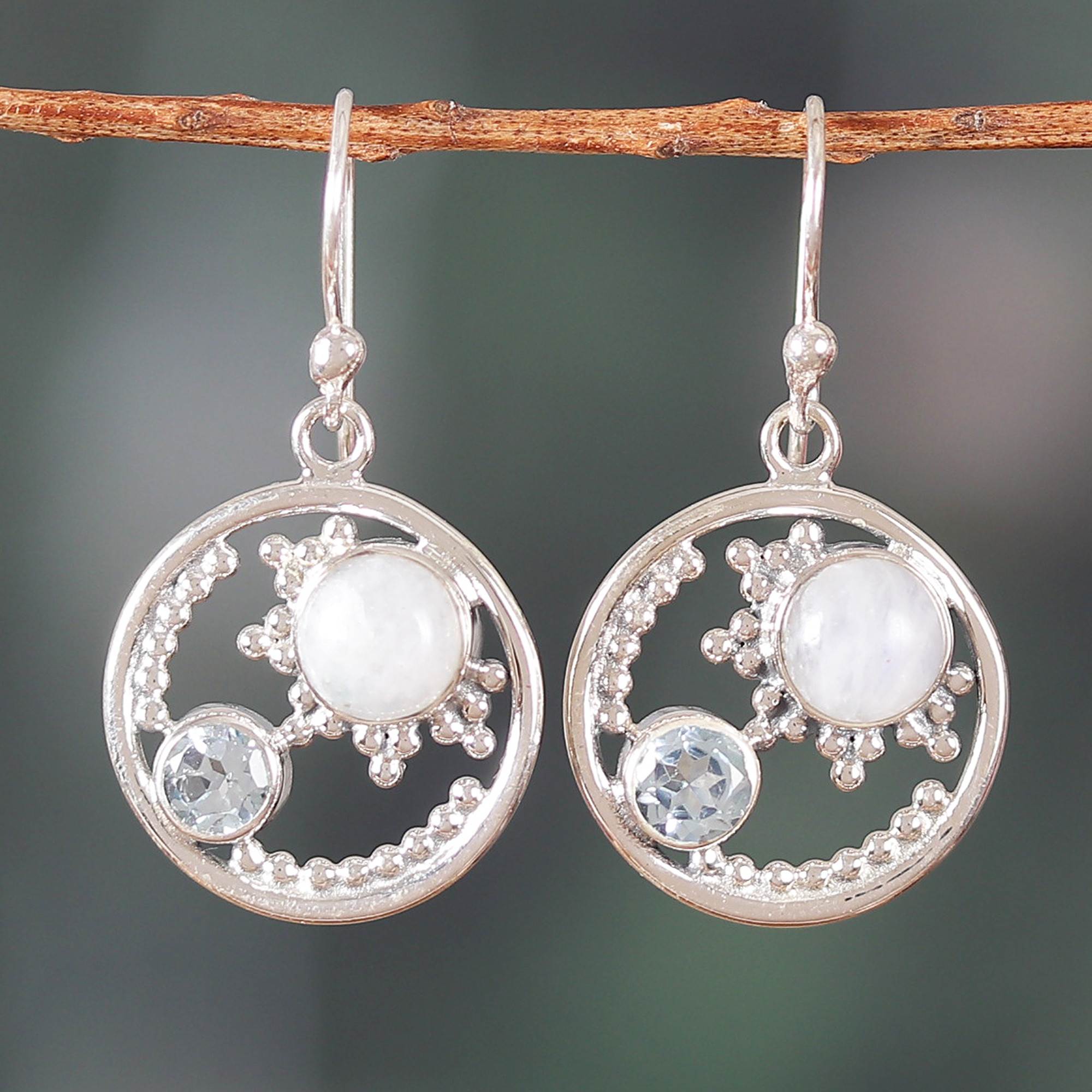 One-Carat Blue Topaz and Natural Rainbow Moonstone Earrings, 'Little Harmonious World'