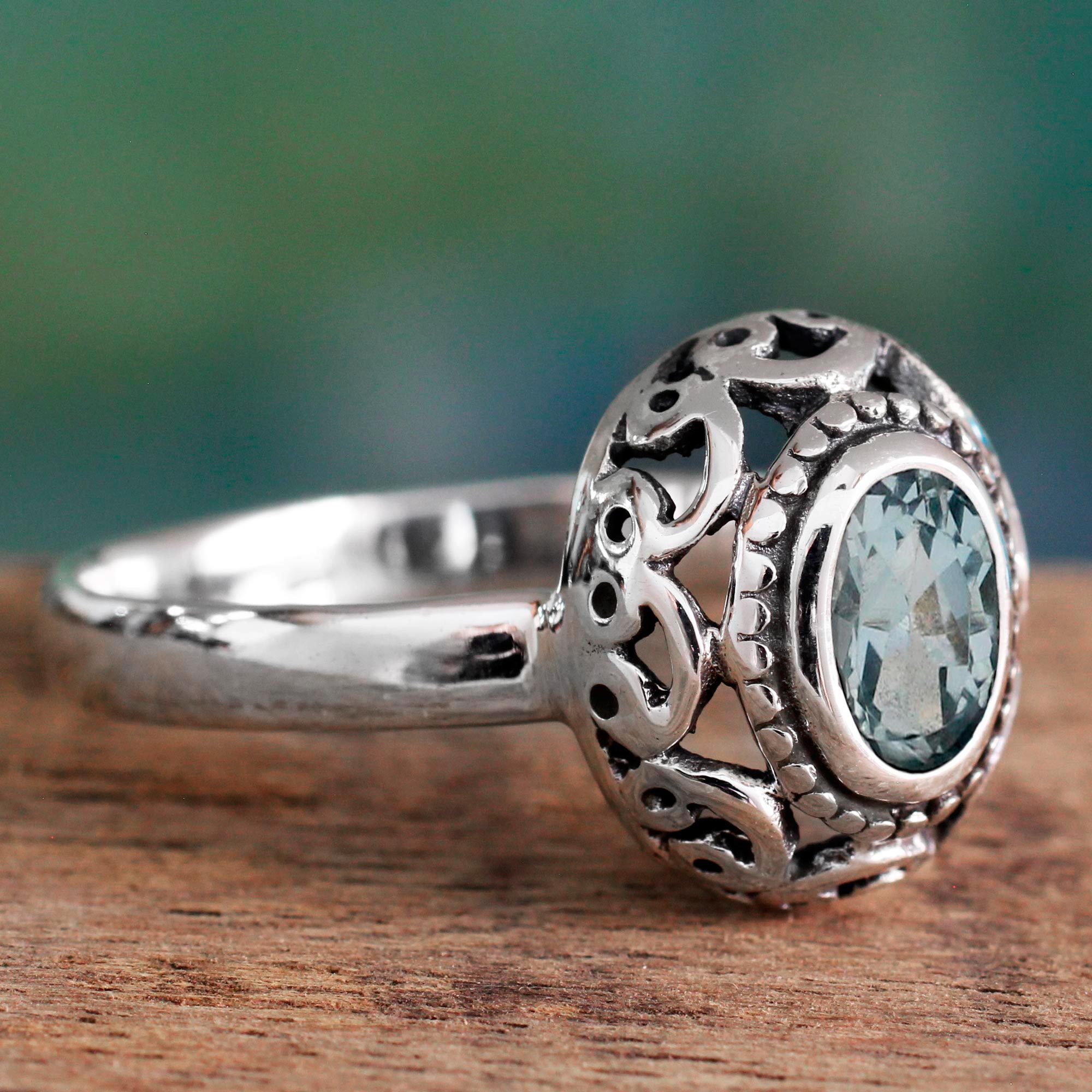 Sparkling light blue topaz hints of celestial harmony in this lovely ring from Aparna in India. The artisan sets the one-carat oval gemstone in sterling silver with an elaborate curling vine motif around the bezel, offset by a classic plain band.