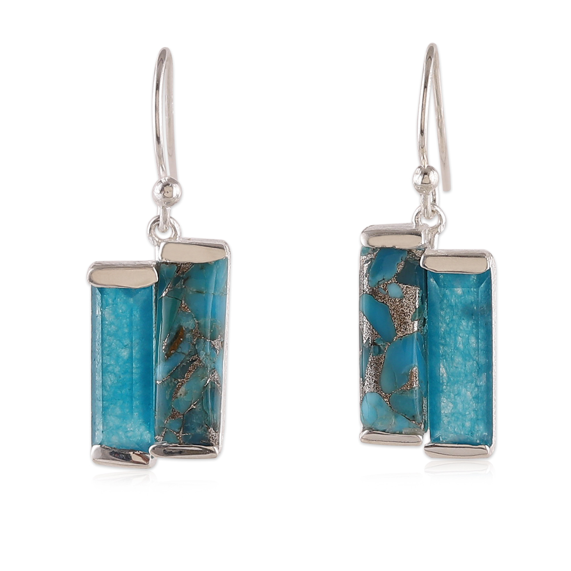 Dive into the ethereal ocean that lives inside these dangle earrings by India's Neetu Barathi. Infused with an abstract vibe that transports you to mysterious waters, this modern one-carat pair showcases composite turquoise and quartz jewels in an inlaid sterling silver bezel setting, letting the serene hues and shiny accents create a mystic illusion.