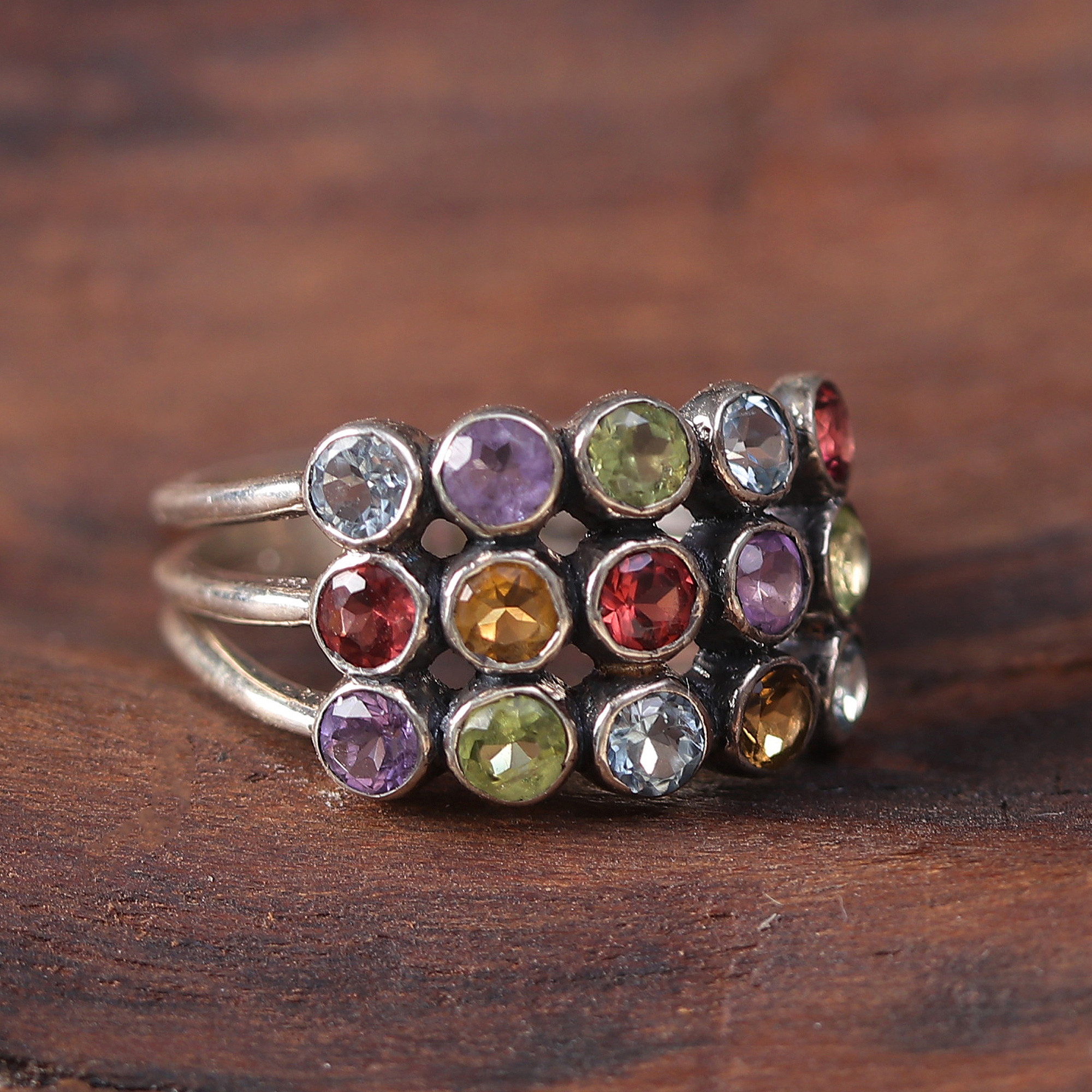 An alliance between amethyst, garnet, blue topaz, peridot and citrine jewels crowns Bhavya Jain's newest design with majesty and beauty. Displaying the mystic essence of each gemstone in a faceted composition of round gems—totaling over one carat—this sterling silver cocktail ring from India is the perfect accessory to make an enchanting statement of luxury.