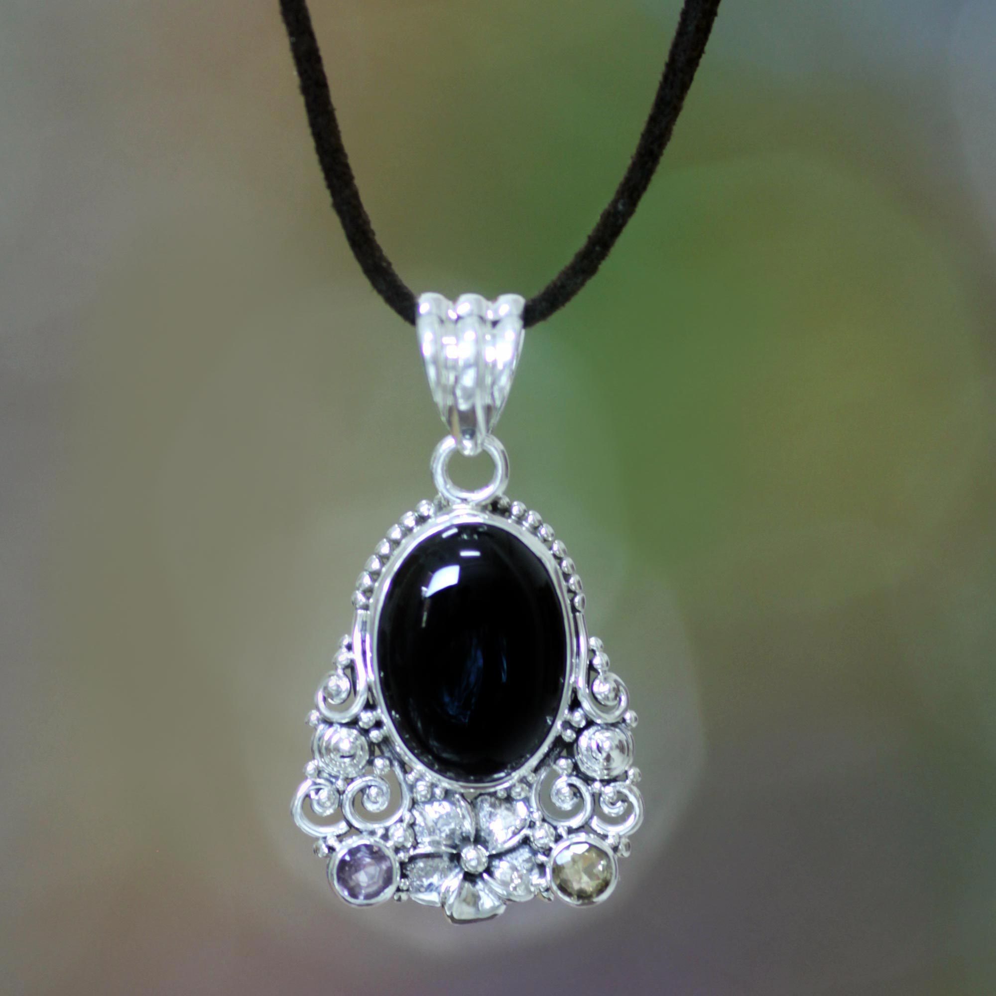 The florid design of this necklace by Buana is mesmerizing. Detailed in sterling silver, the handcrafted pendant is centered with glistening onyx. Amethyst and citrine sparkle like early morning dew. The necklace is worn on a dark brown faux suede cord.