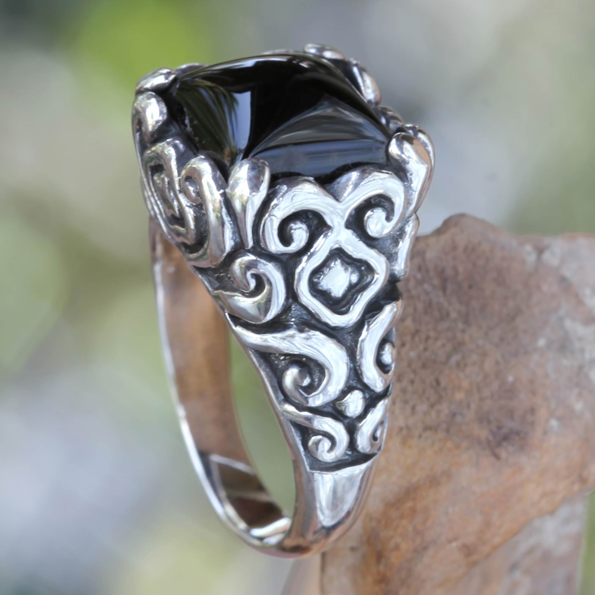 Like mysterious symbols on ancient temple walls, the deeply etched motifs on this sterling silver ring by Bali artisan Kadek Hendra are intriguing. The ornate setting holds a cabochon onyx stone, black as midnight,in its grasp.